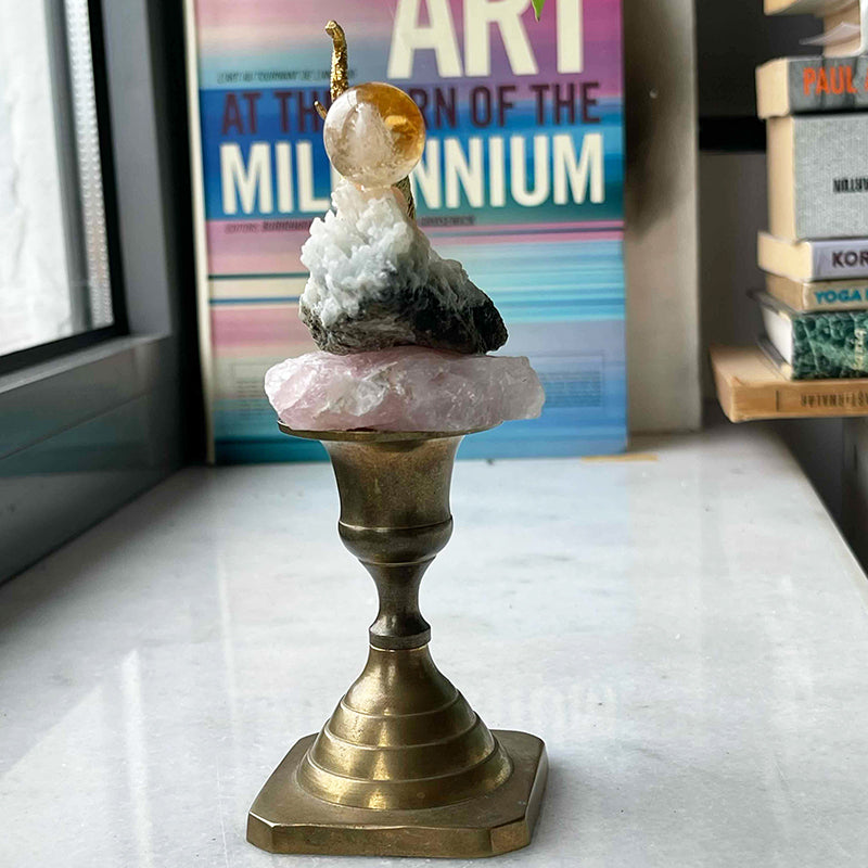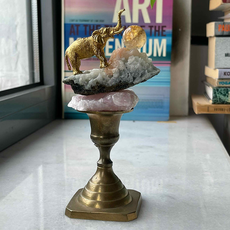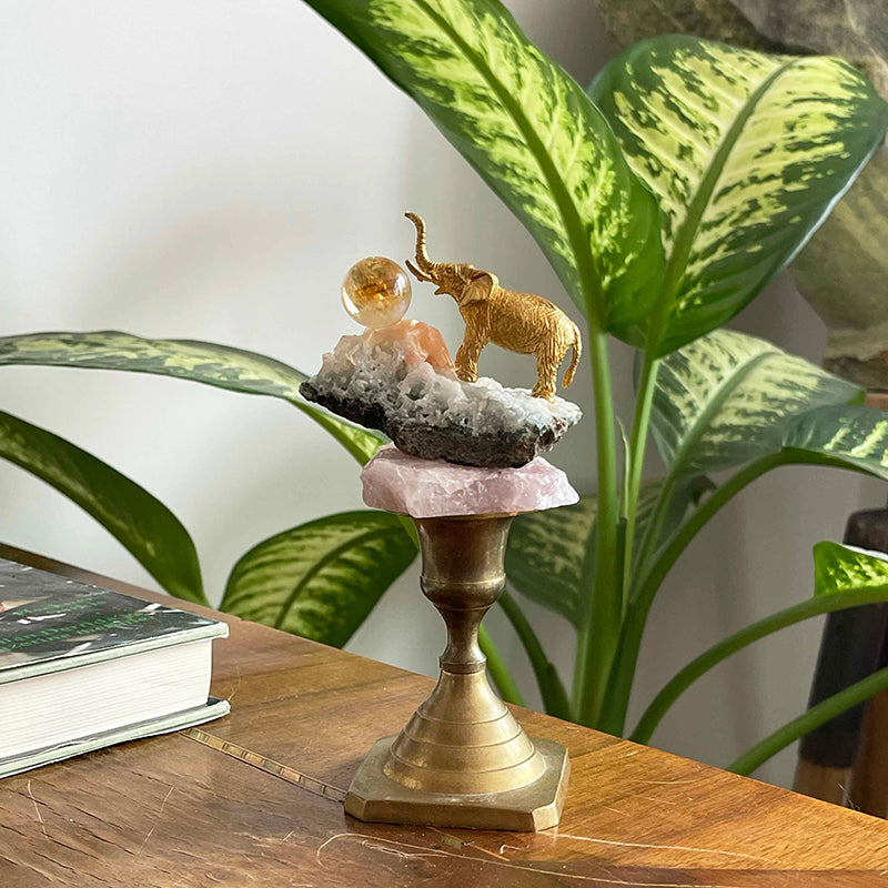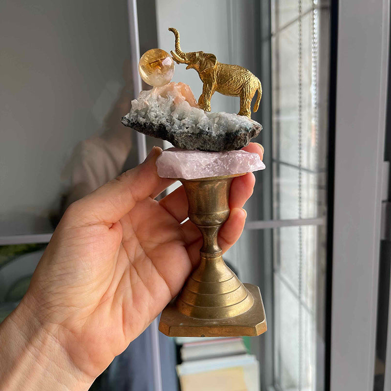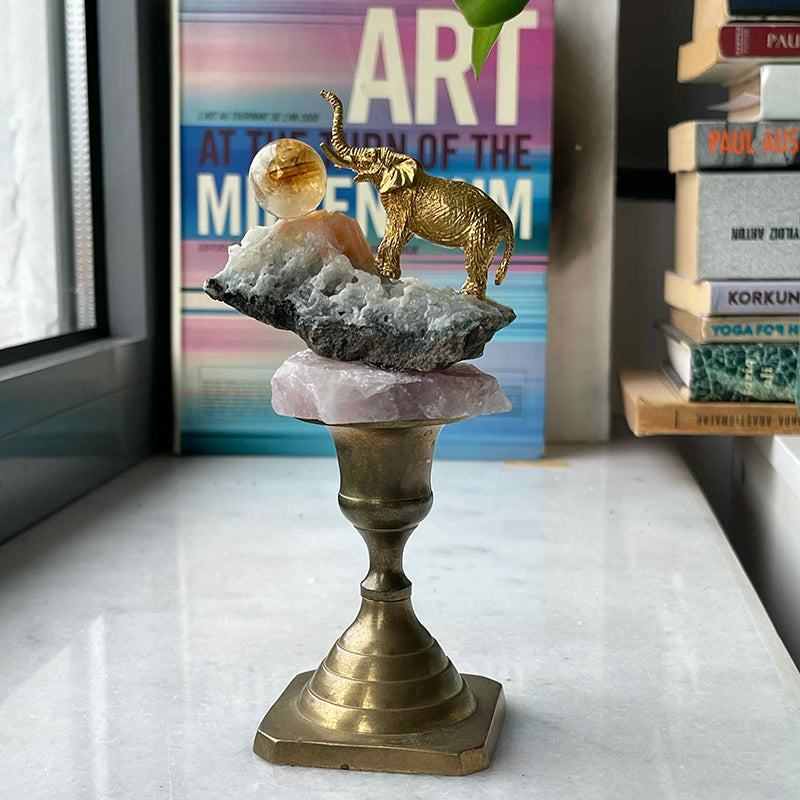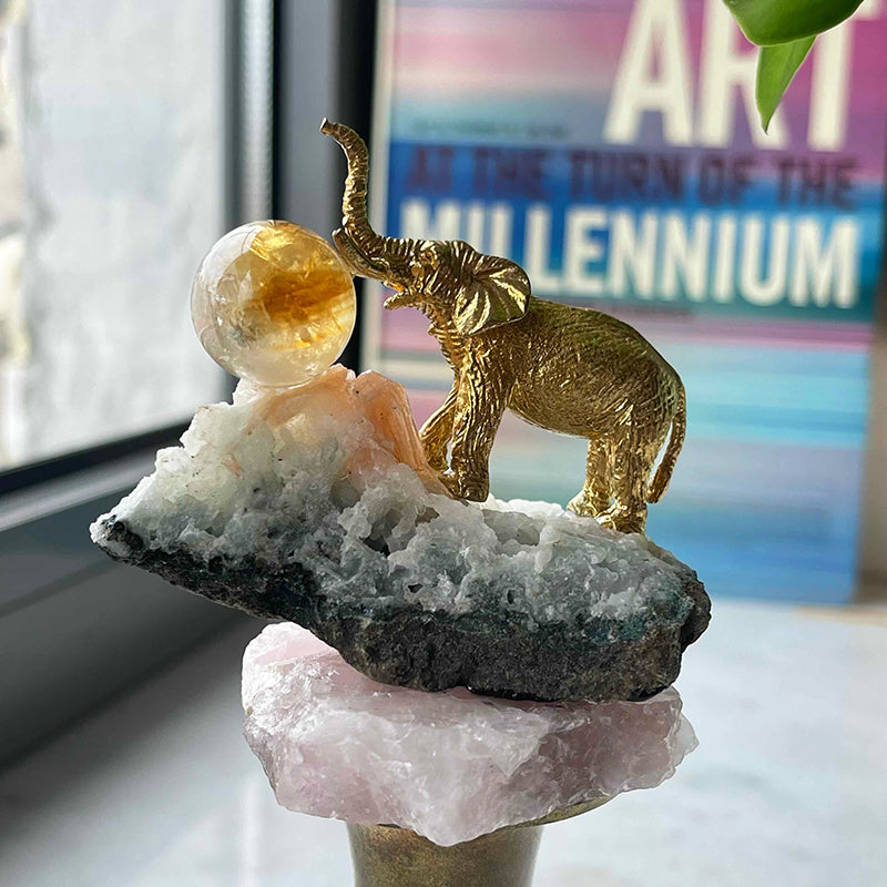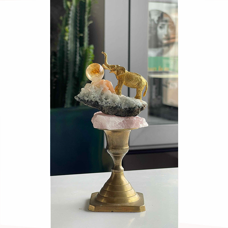 The brass elephant figure, which is the complementary element of the sculpture made of Rose Quartz, Apophyllite crystal and Citrine in sphere form on a brass base, is a symbol of power and good fortune. This unique piece adds value to the space both aesthetically and energetically.