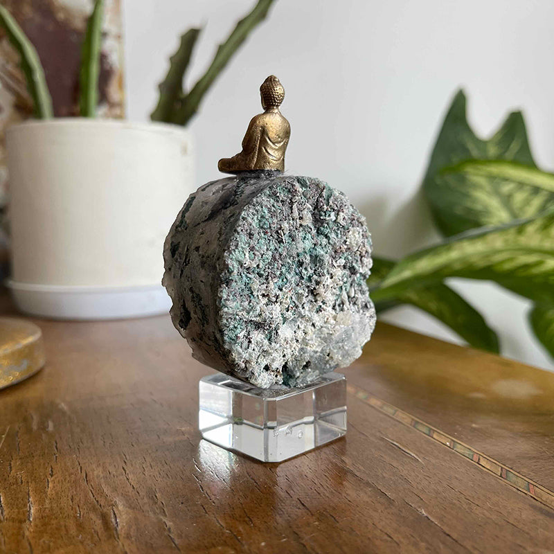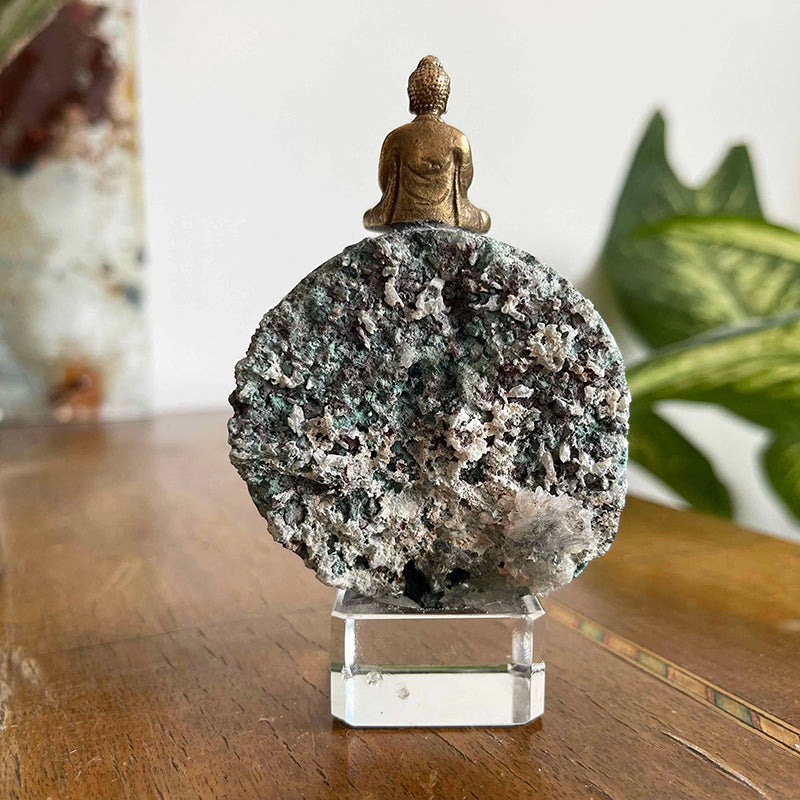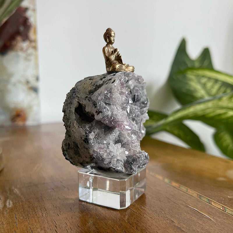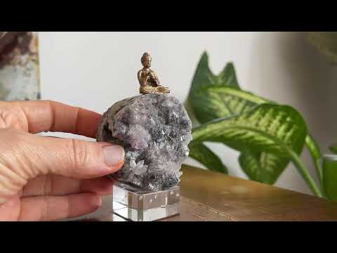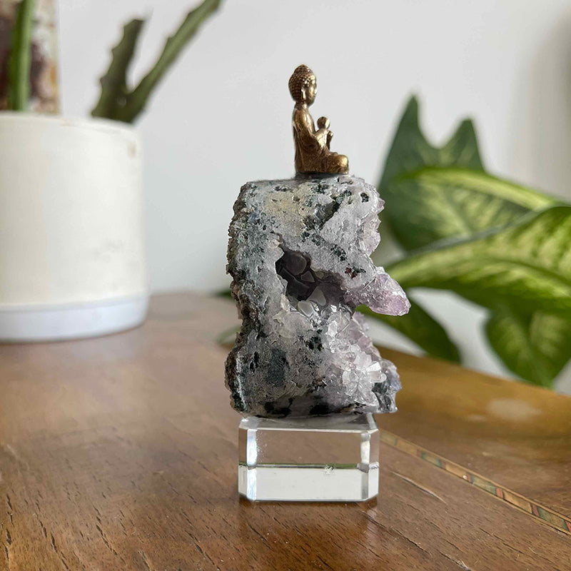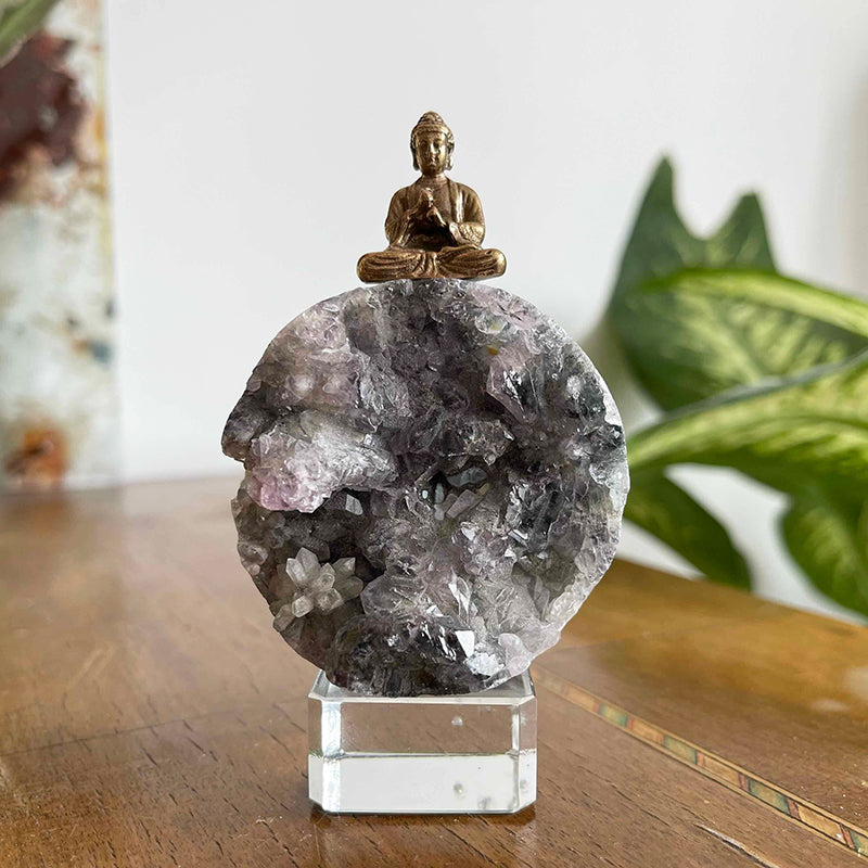 This decorative work, consisting of an amethyst and brass Buddha figure in a circular form, is reminiscent of a purification ritual.
