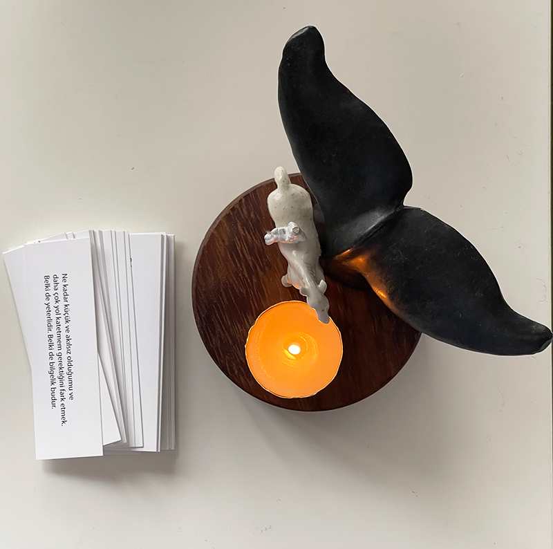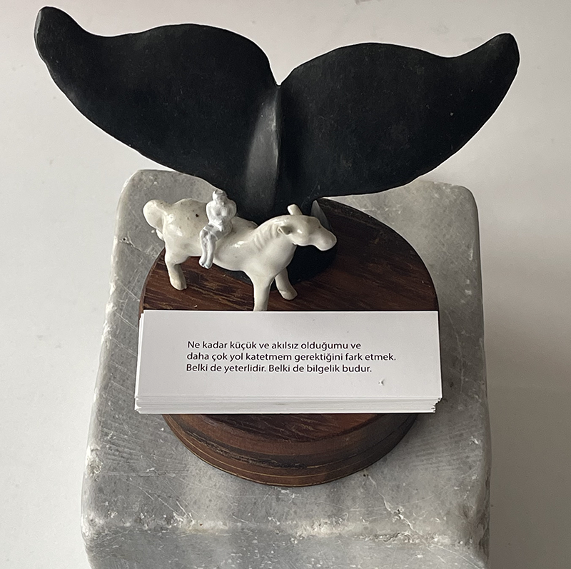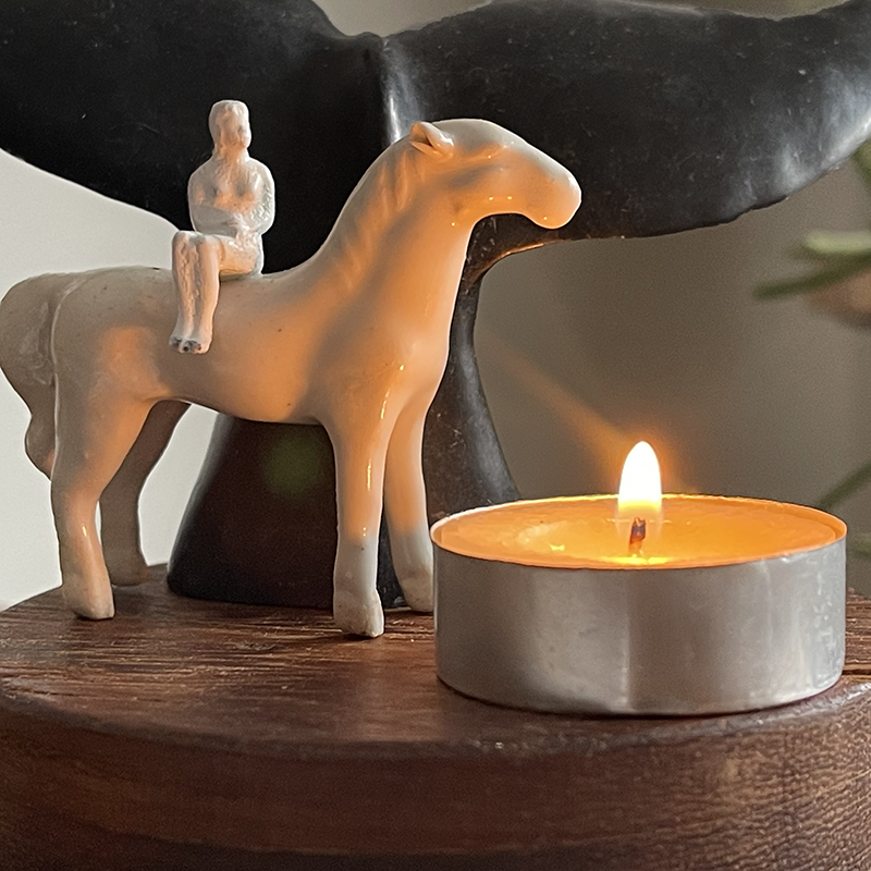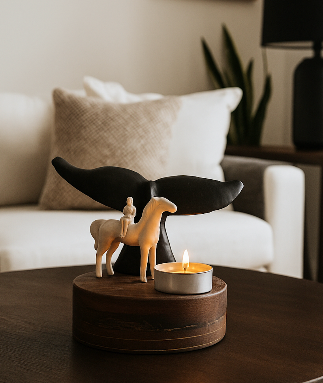 Bu benzersiz dekoratif çalışma, iki yönlü kullanım özelliğiyle fonksiyonelliği sanata dönüştürüyor. Akşam saatlerinde atın ön kısmına yerleştirilen bir tea light mum, ortama yumuşak ve davetkâr bir ışık yayarken, sembolik olarak atın üzerindeki kadının yolunu aydınlatır. Mumun kaldırılmasıyla ortaya çıkan özel bölmede ilham verici kartlar sergilenebilir. Her kart, güne anlam katan sözlerle dolu. Her biri kadın için bir adım, bir nefes, bir fark ediş...