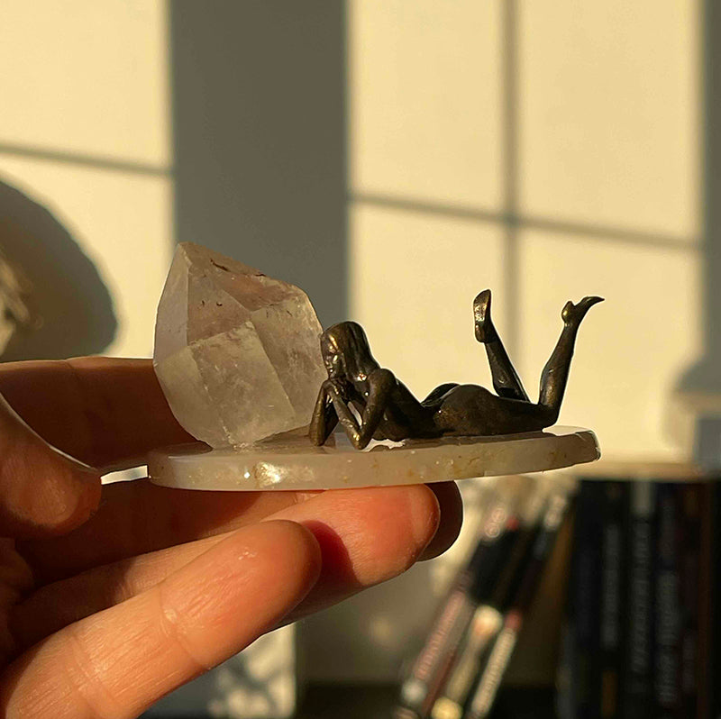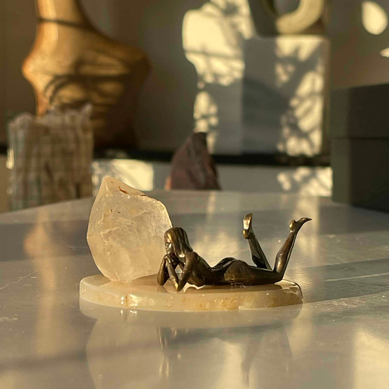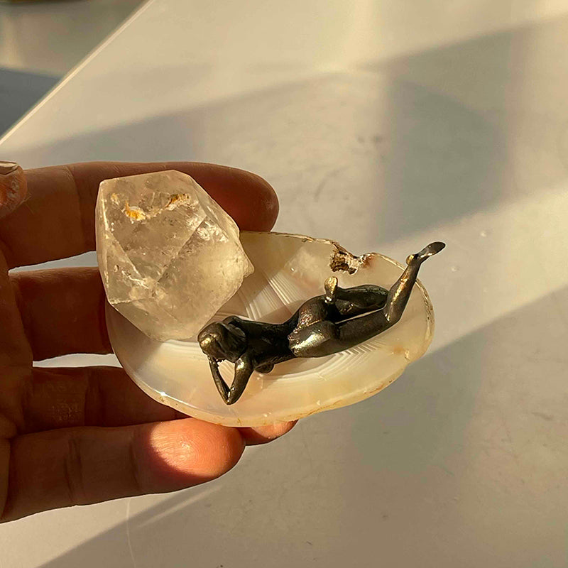 Crystal Quartz on Agate Crystal and a reclining metal girl figure.