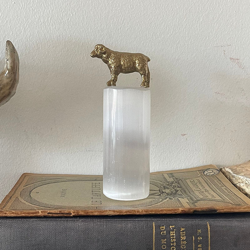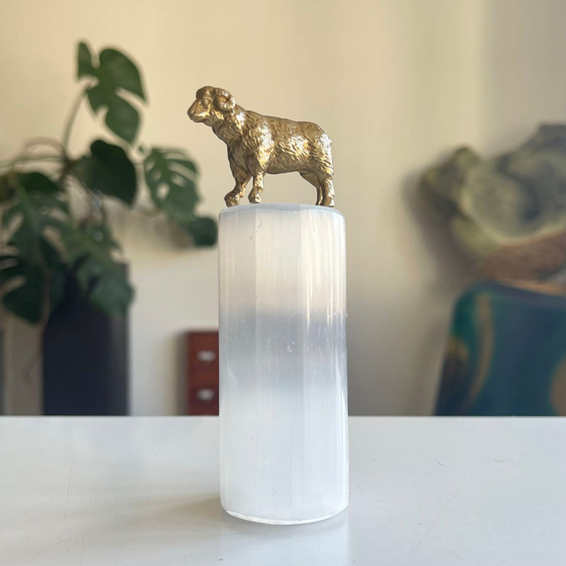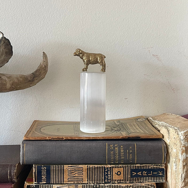 Silindir formunda Selenit kristali üzerine yerleştirilmiş pirinç koç figürü, ışıkla gücün buluştuğu bir tasarım.