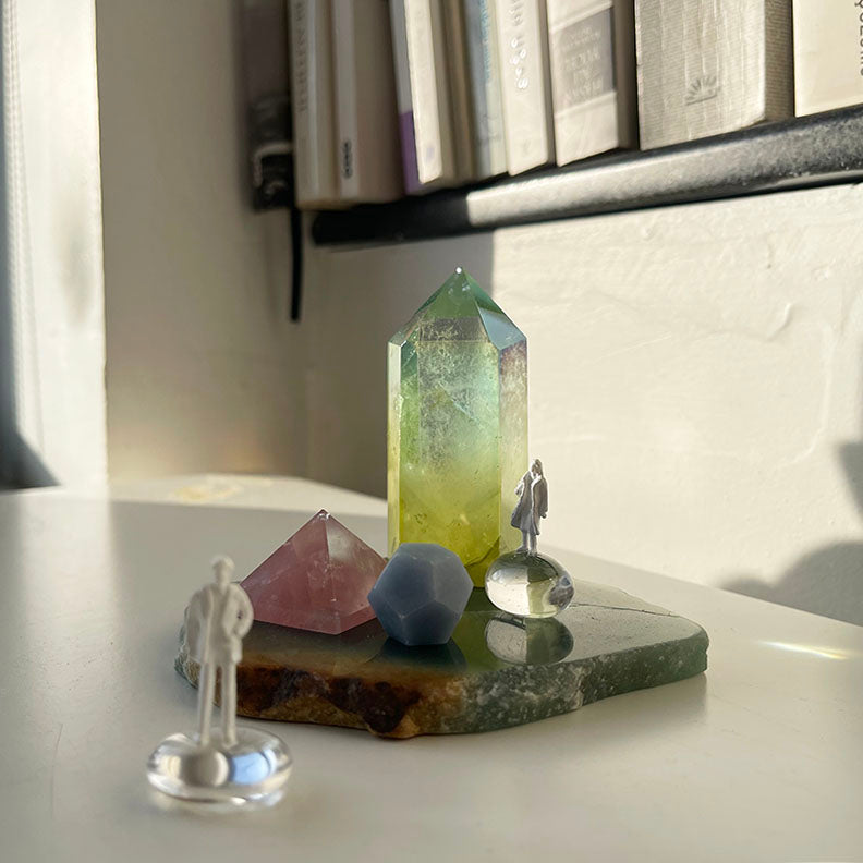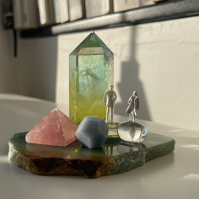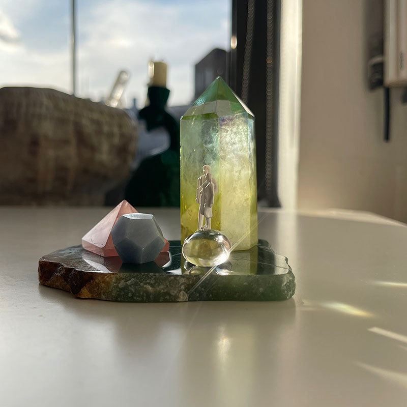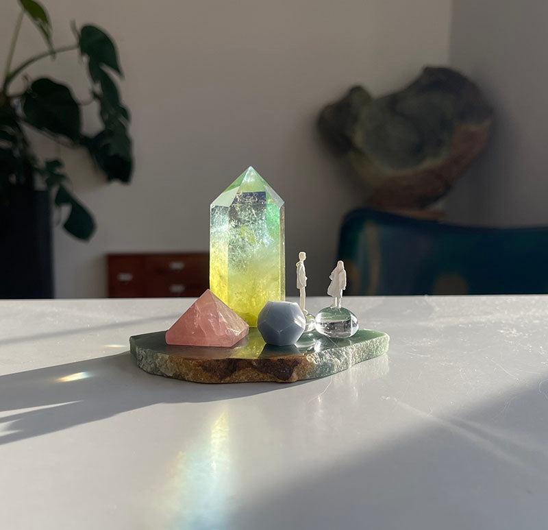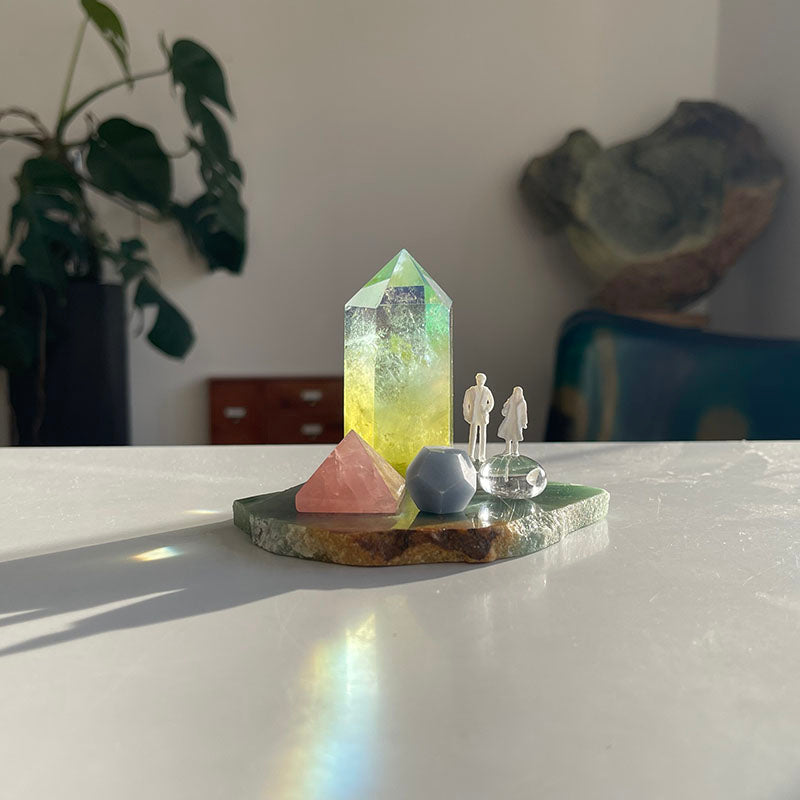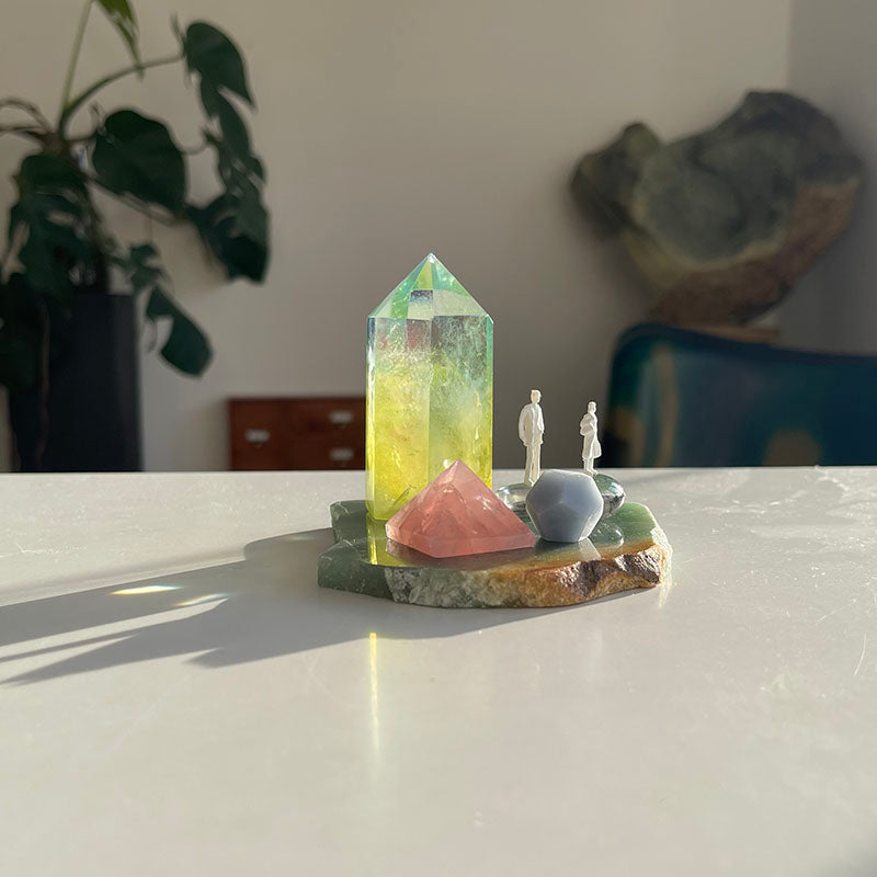 Bu oyuncu çalışma Aventurin tabaka ile başlıyor. Üzerindeki limon sarısı ve su yeşili tonlarında olan Aura Kuvars kule, ilişkinin içindeki dönüşüm enerjisini,