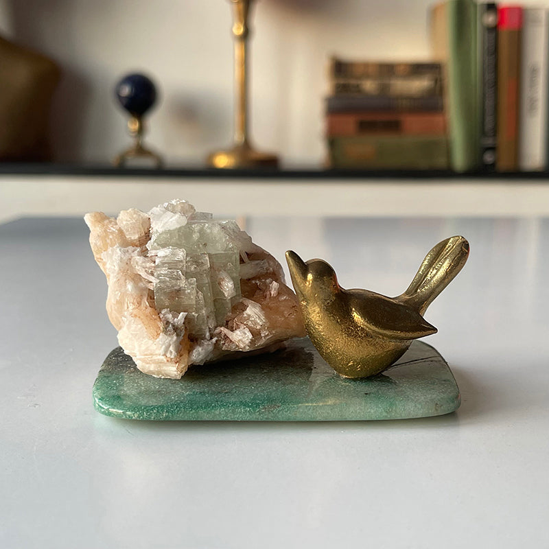 This special design features Apophyllite crystal on Green Agate with a brass bird figure next to it, creating a symbolically and energetically powerful combination. This trio will help bring you increased energy, freedom and inner peace.