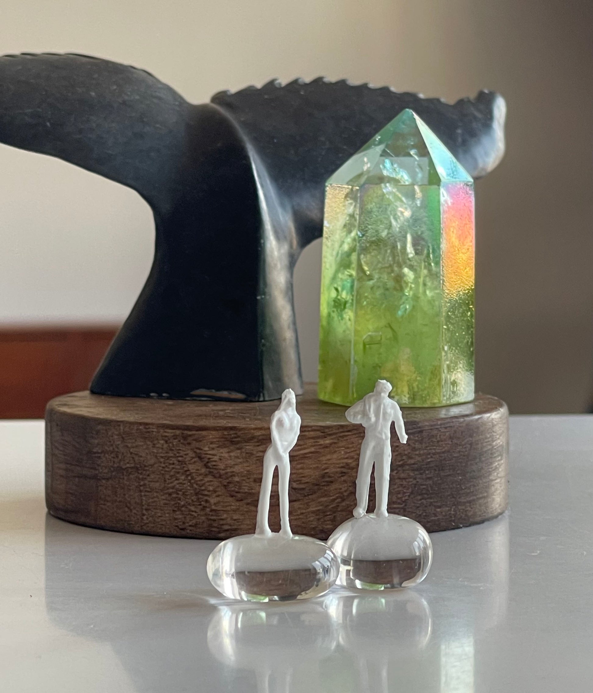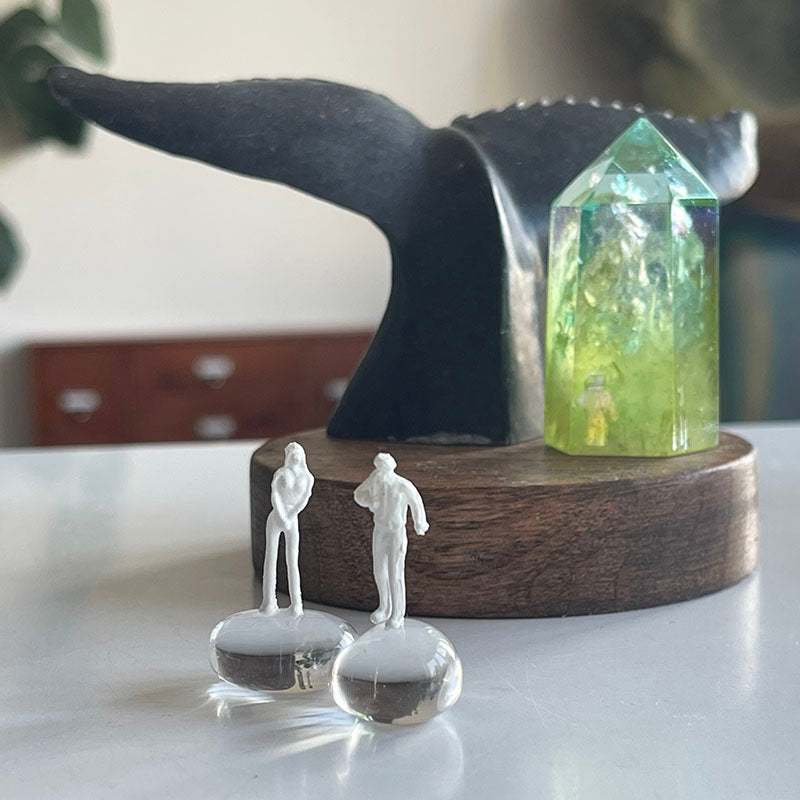 Kadın ve erkek figürleri, Kristal Kuvars taşlarının üzerinde serbest durur. Kaideye sabit değildirler; bu da kompozisyona canlılık ve hareket hissi kazandırır. Sanki biraz sonra birlikte yola çıkacaklarmış gibi oyuncu, özgür ve dinamik bir enerji taşırlar.