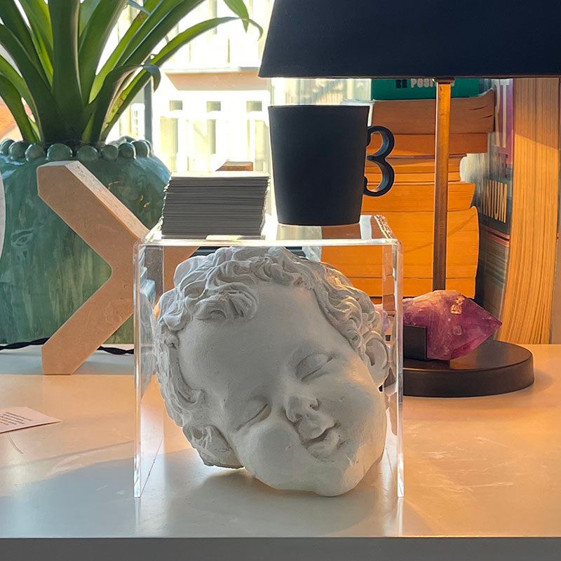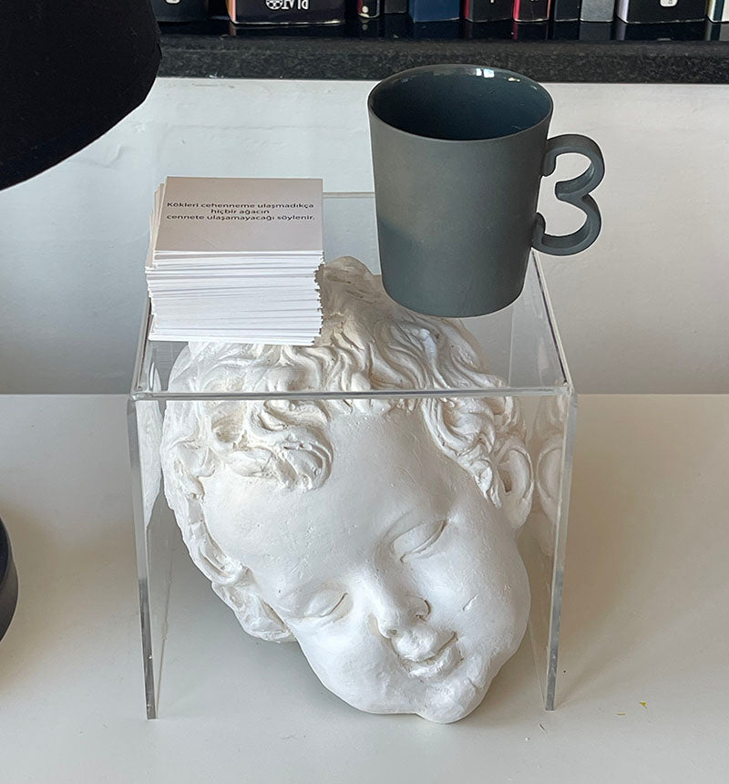 Şeffaf pleksi mini sehpanın altında yer alan bebek büstü, ruhunuzdaki masumiyeti ve saf neşeyi yani içinizdeki çocuğu simgeler. Her sabah kahvenizi onunla paylaşarak kendinize göstereceğiniz ilgi ve onay sayesinde, dışarıdan gelecek ilgi ve onaya daha az ihtiyaç duymamanın rahatlığını hissetmeniz amaçlandı.