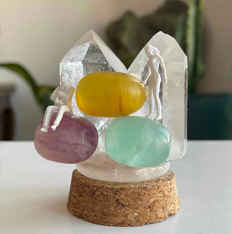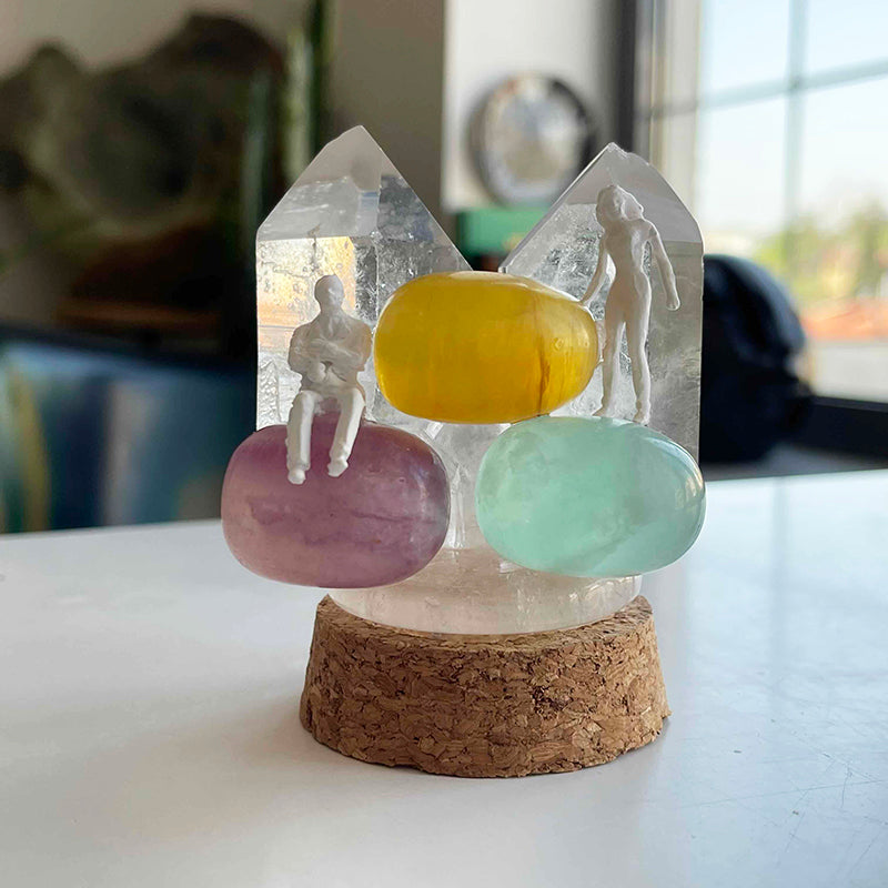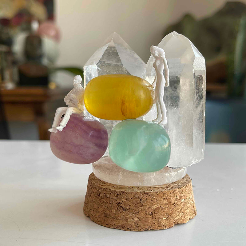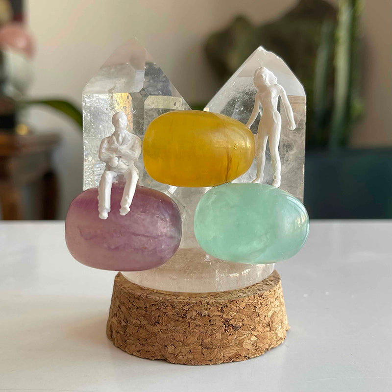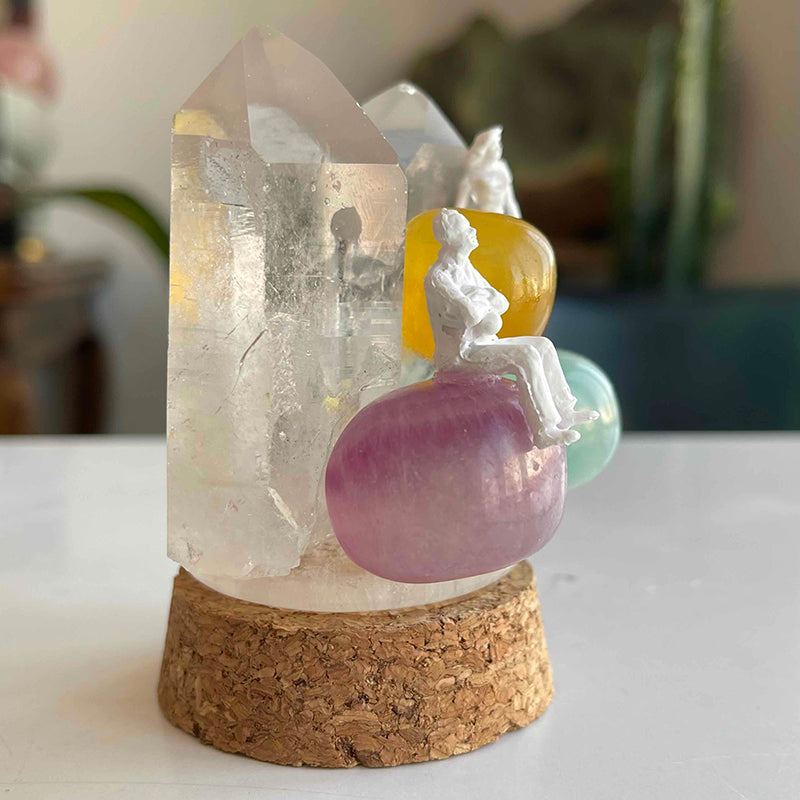 The work is composed of colorful Fluorite crystals and Crystal Quartz towers, symbolizing a couple who have grown distant from each other but whose minds are still on each other.