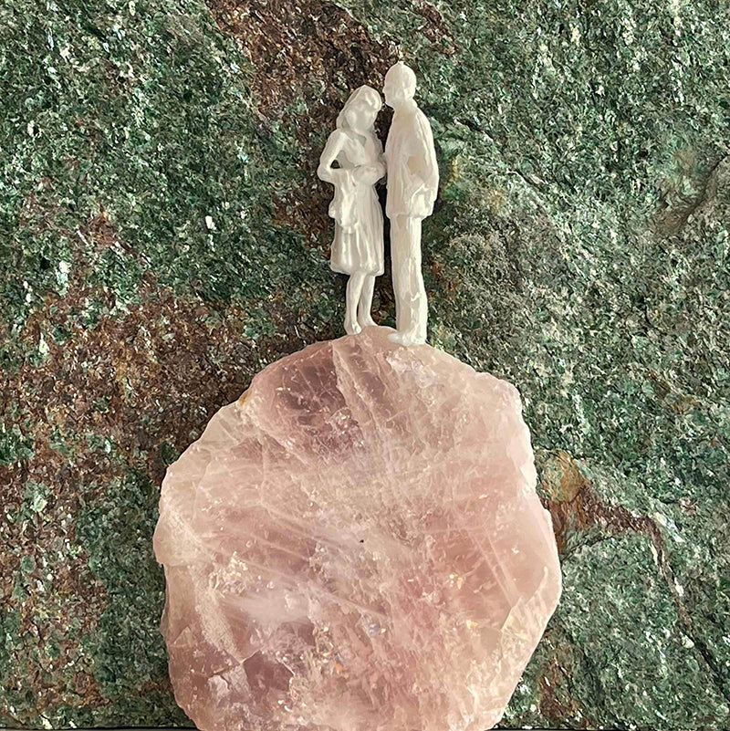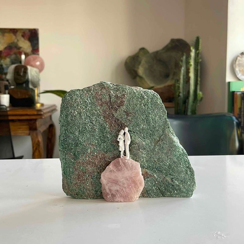 This work, symbolizing a spiritual union, consists of green Fuchsite and Rose Quartz...
