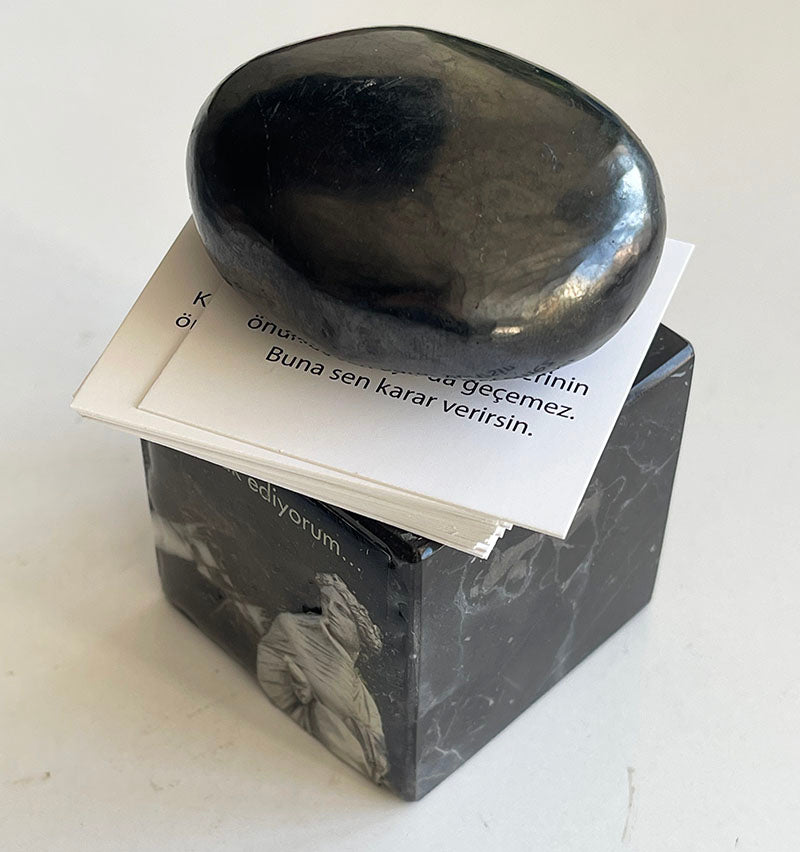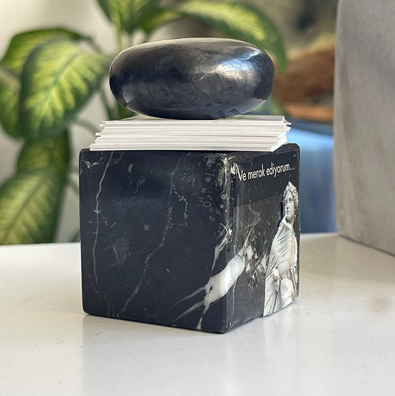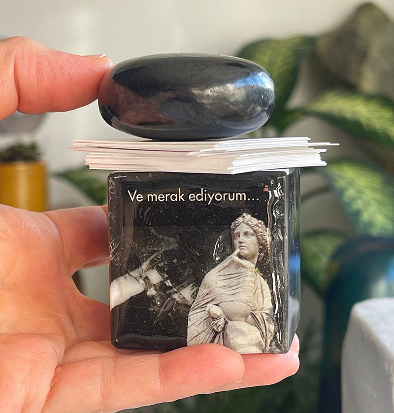 Siyah granit küpün üzerinde tarihten kopup gelmiş bir kadın figürü ile "...ve merak ediyorum" yazısı şeffaf bir malzemeyle kaplanmıştır. Üzerine yerleştirilmiş olan, hayatla ilgili ilham verici ve düşünmeye sevkeden sözler içeren 21 kart, Zen stilinde, antrasit bir Şungit taşı tarafından tutuluyor. Bu kombinasyon, kişinin kendini tanıma yolculuğuna ve içsel keşif sürecine duyduğu merakı simgeler. Her insanın kendini bilmesi, eninde sonunda kendi peşine düşmesi gerekliliği mesajını taşır.