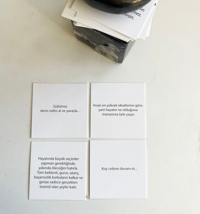 Güçlü ve dayanıklı granit küp, hayatın sağlam temellerini ve bireyin kendi içinde bulduğu güçle bu yolculuğu sürdürebilme kapasitesini temsil eder. Üzerindeki kadın figürü ise kişisel tarihimizin, köklerimizin ve geçmişle olan bağlantımızın bir simgesidir. Kartlar, bilginin, kitapların ve okumanın simgesidir. Kitaplar kişisel yolculuğumuz boyunca bize rehberlik eden ve derin düşünmeye sevk eden ilham kaynaklarıdır.