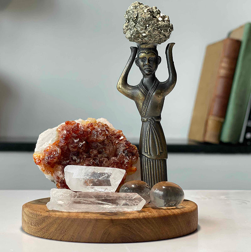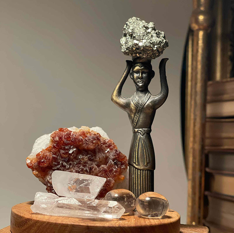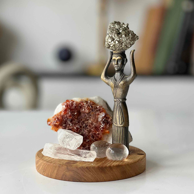 A large Citrine crystal rising on a wooden base, surrounded by Crystal Quartzes in various forms, an elegant brass female figure, and a Pyrite stone shining like a treasure on her head , attract attention. This decorative sculpture is a symbol of inner peace and abundance.