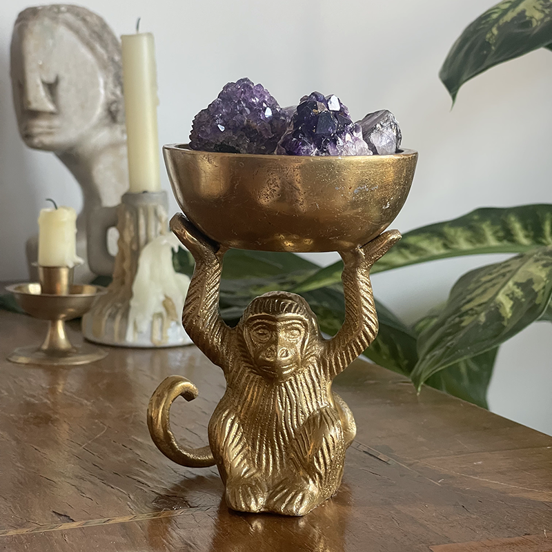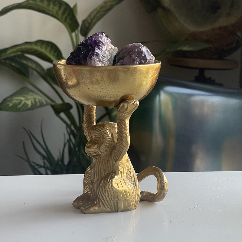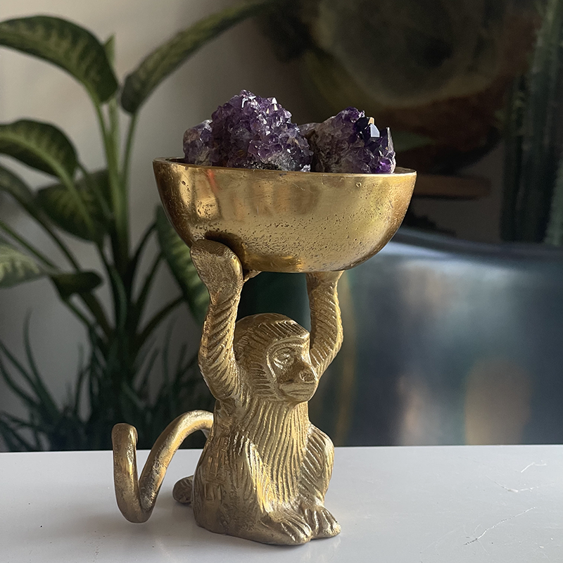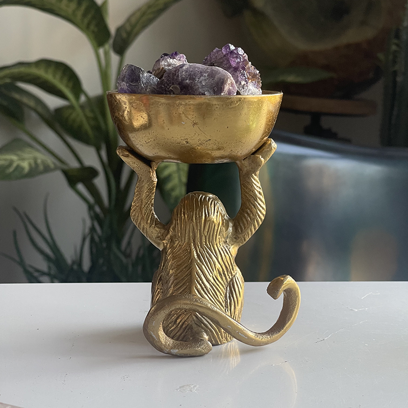 Amethyst crystals in a brass bowl with monkeys It is a relaxing energy that we all need. This stone helps relieve daily stress and is a great crystal to keep in your bedroom for a restful sleep. It works with the third eye and crown chakras, improving your intuition and thus supporting your decision-making skills.