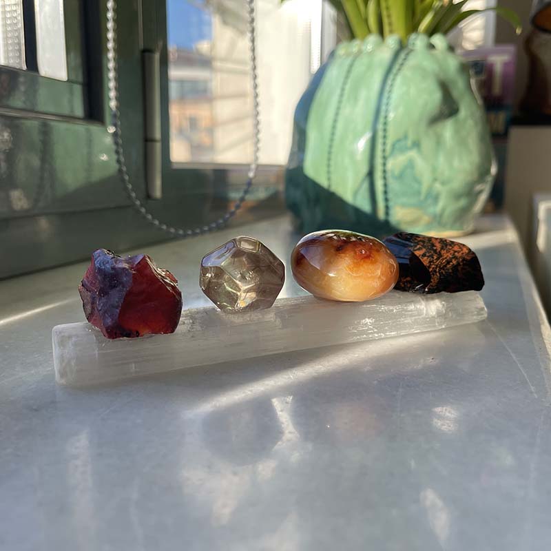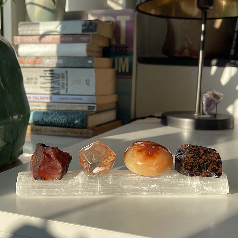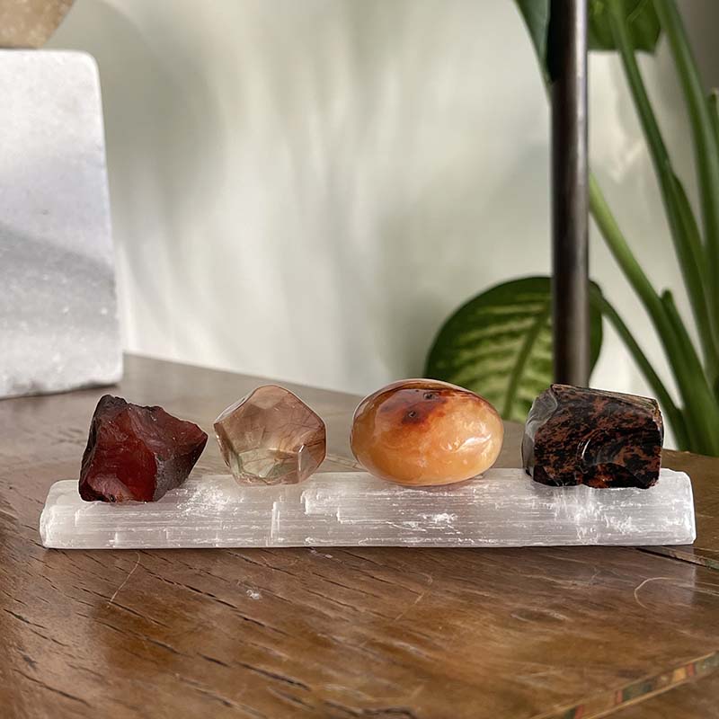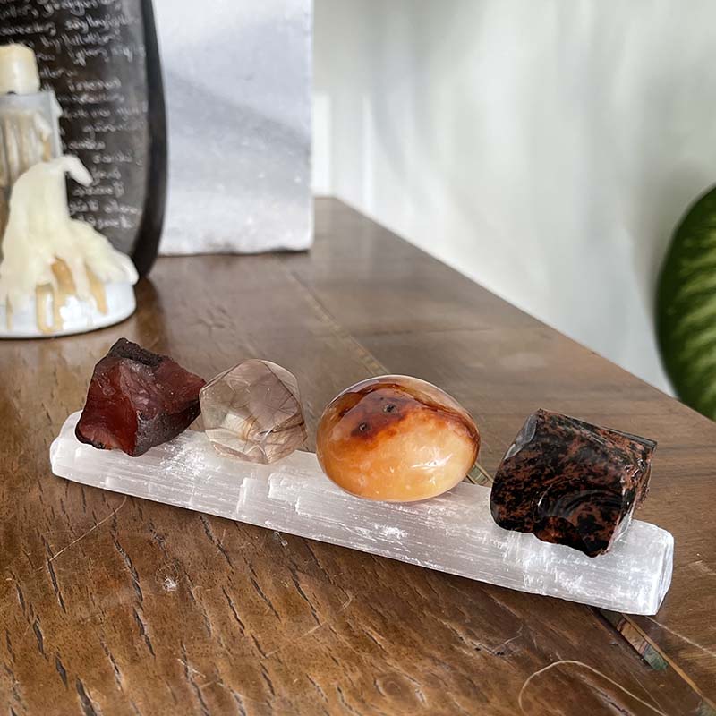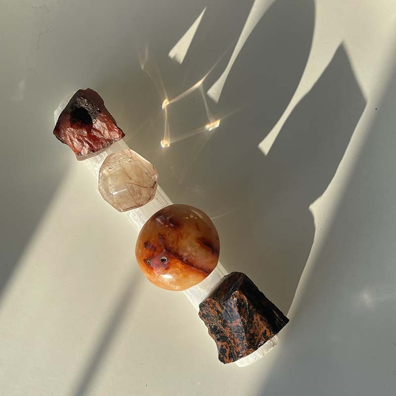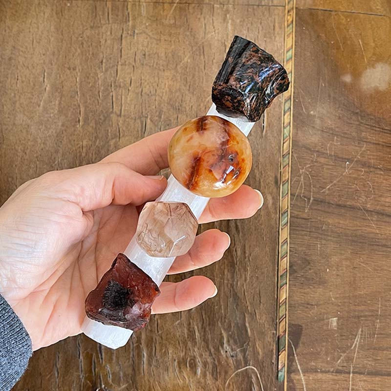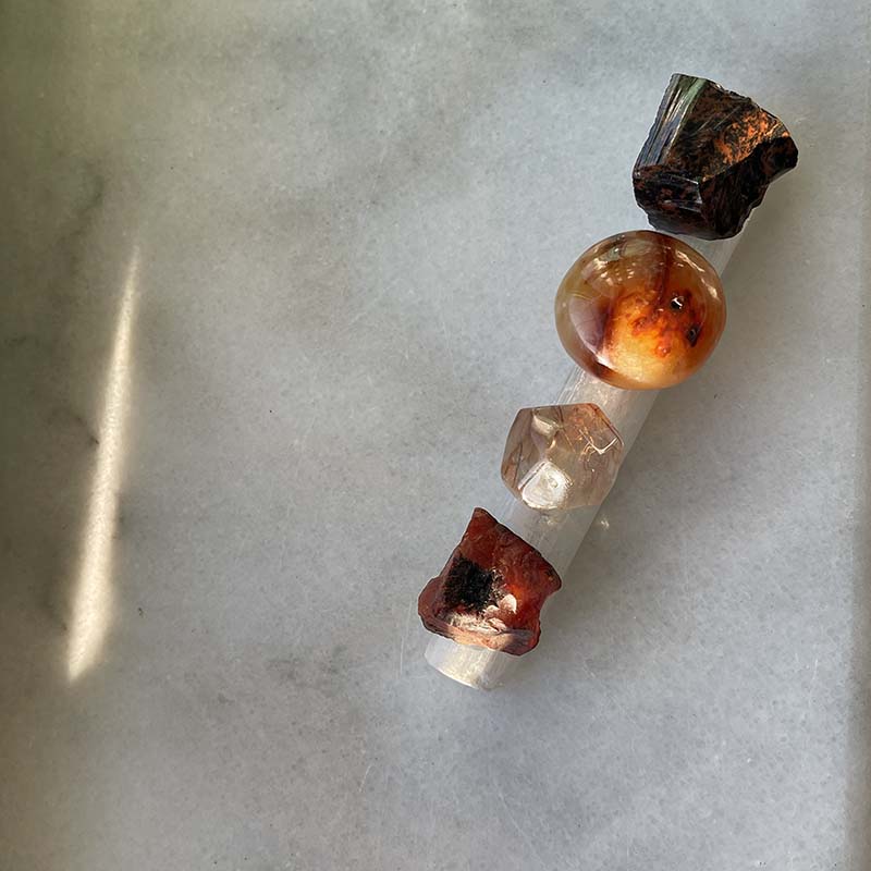 Selenit çubuğun üzerinde sırasıyla sabitlenmiş ham Karnelyan, berrak Ametist, oval Akik ve Mahogany Obsidyen taşlarıyla tasarlanmış bu çalışma, hem şıklığı, hem de ruhunuzu besleyecek enerjiyi bir araya getiriyor