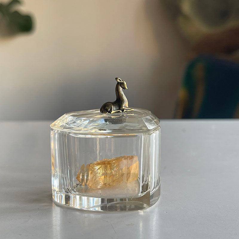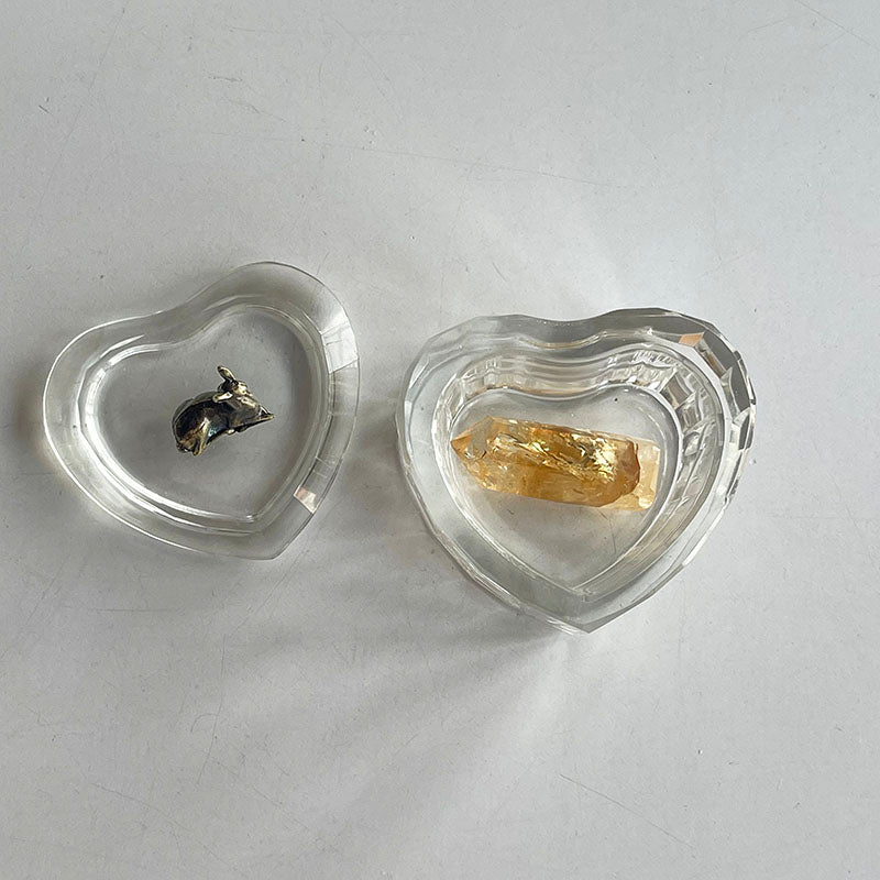 Kalp şeklindeki kapaklı minik cam kutu, içsel niyeti ve değer verilen şeyleri koruma isteğini temsil eder. Üzerindeki pirinç geyik figürü ilerlemeyi ve yaşamın sunduğu fırsatlara açık kalmayı simgeler.