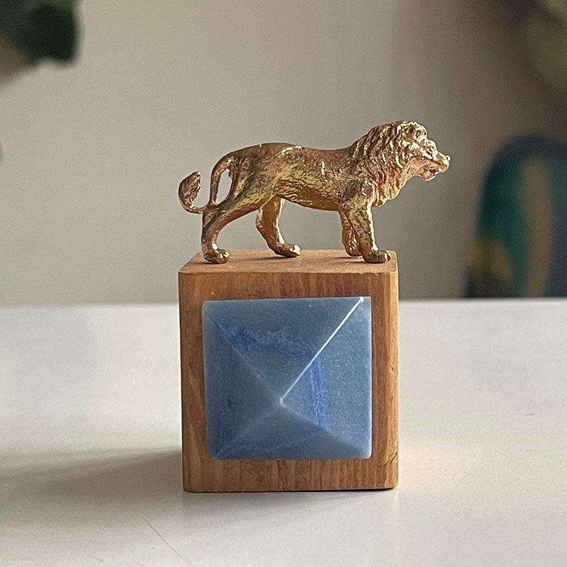 Küp formunda ahşap kaide üzerinde bir pirinç aslan ve ahşap kaidenin ön yüzünde piramit Kalsedon.