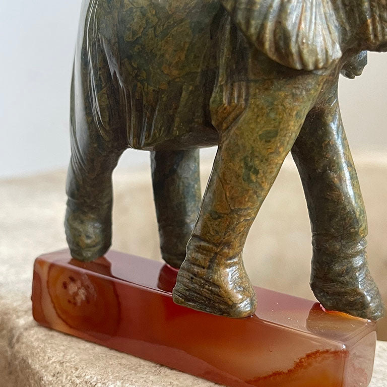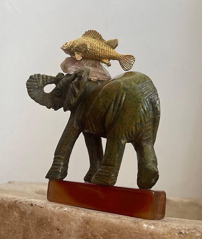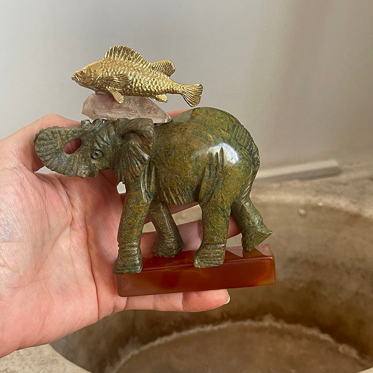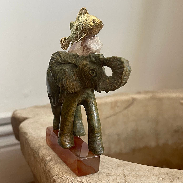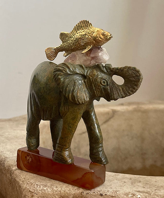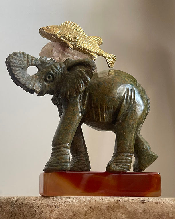 Afrikalı bir sanatçının elinden çıkmış olan bu fil heykeli, Serpantin taşından  şekillendirilmiştir. Sırtında Dumanlı Kuvars kristali taşır. Bu taş, arındırıcı ve dengeleyici etkisiyle bilinir. Geçmişle bağları çözmeyi, zihni sakinleştirmeyi destekler. Kristalin üzerinde yer alan pirinç balık figürü sezgiyi ve bereketi temsil eder. Heykelin Karnelyan kaidesi ise canlılık, cesaret ve motivasyon verir.