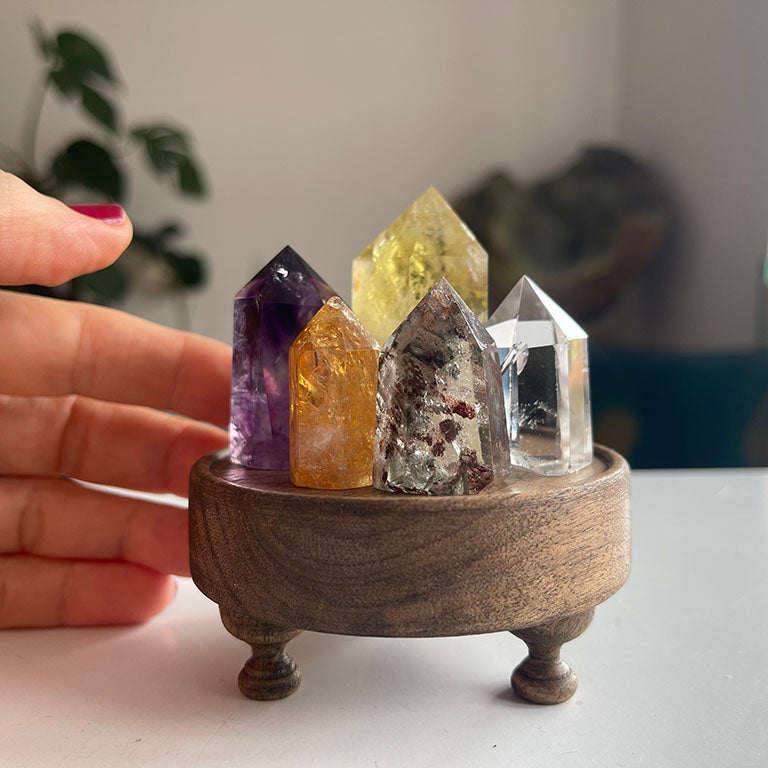 Özel ayaklı ahşap standın üzerinde bir araya gelen beş kuvars kule, tek bir merkezde toplanmış beş farklı titreşim yaratıyor. Limon Kuvars'ın berrak odaklanma etkisi, Ametist'in zihni sakinleştiren yapısı, Sitrin'in hareket ve neşe enerjisi, Garden Kuvars'ın köklendirici alanı ve Kristal Kuvars'ın tüm bu etkiyi çoğaltan yapısı aynı kompozisyonda birleşiyor. Renklerin netliği ve yüzeydeki ışık oyunu, kompozisyonu hem görsel hem de enerji düzeyinde güçlü bir parça haline getiriyor.