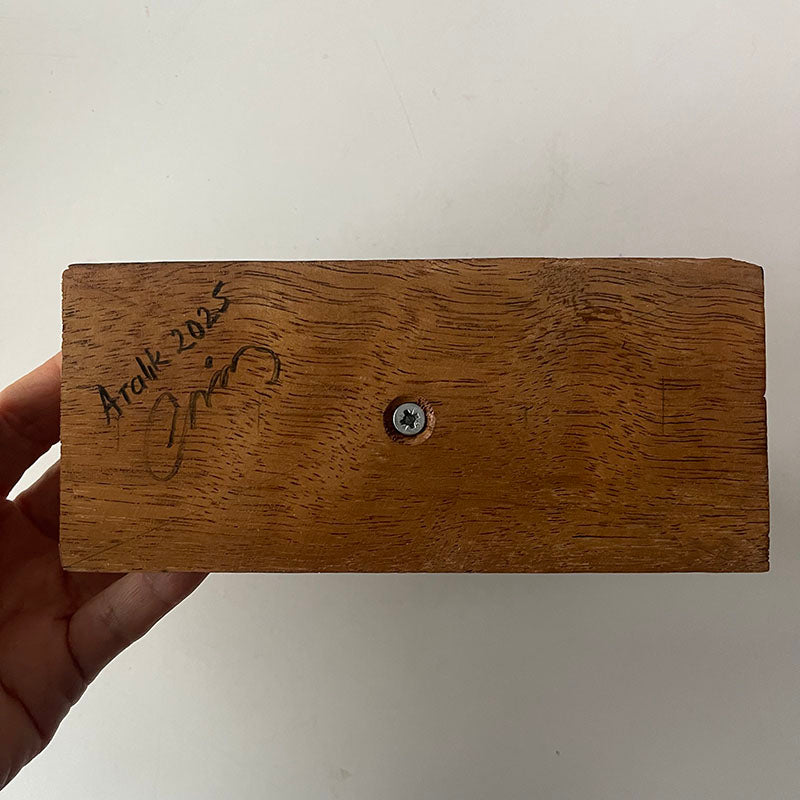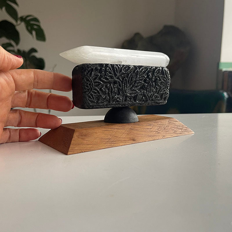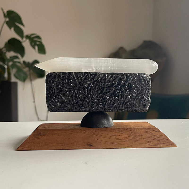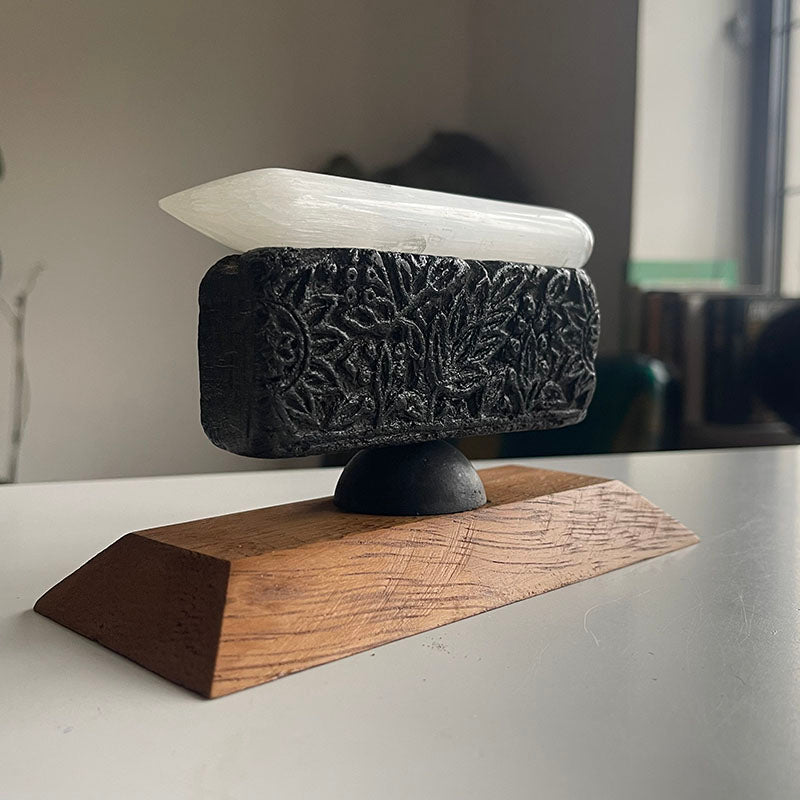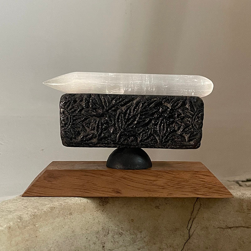 Ahşap kaide üzerine yerleştirilmiş antika kumaş baskı tahtası, el işçiliğinin zamansız izlerini taşır. Üst kısmındaki oyuk, Selenit kristalini taşıyacak şekilde özel olarak hazırlanmıştır. Bu parça özel tasarımdır, geçmişin izleriyle, modern tasarımı ve spiritüel enerjiyi aynı yapı içinde buluşturur.
