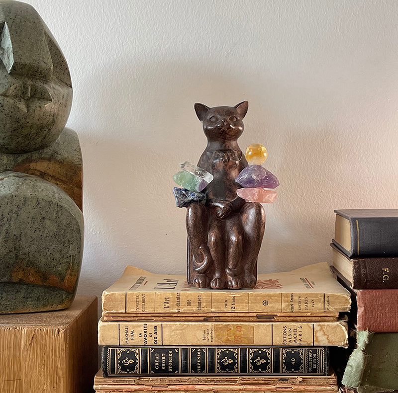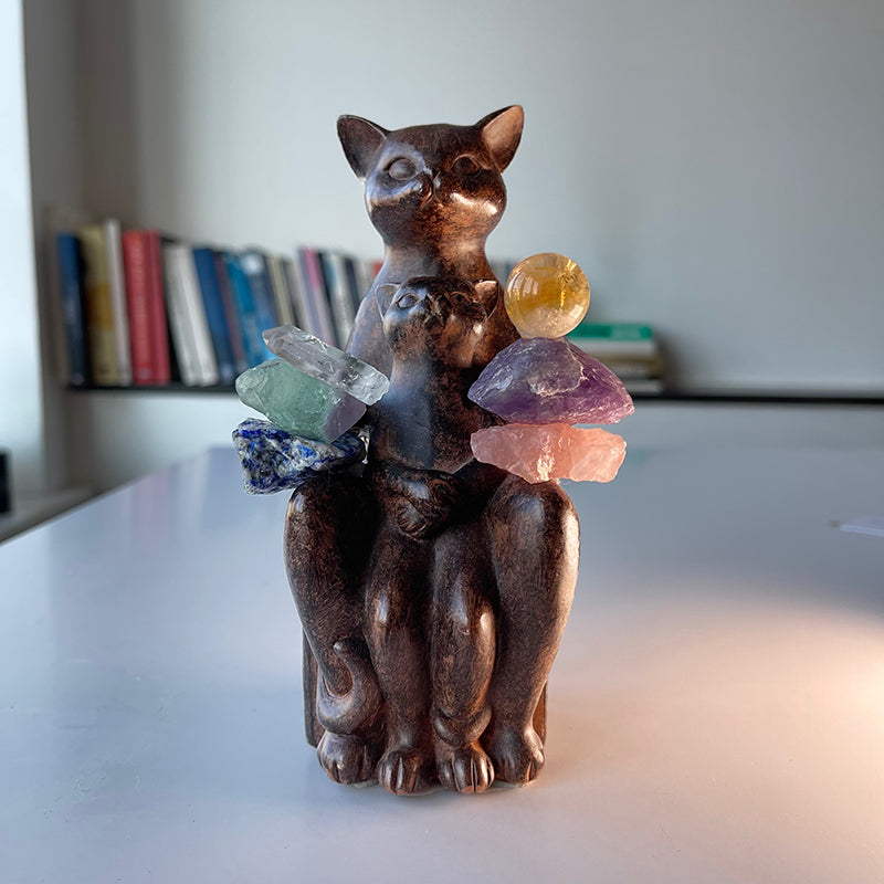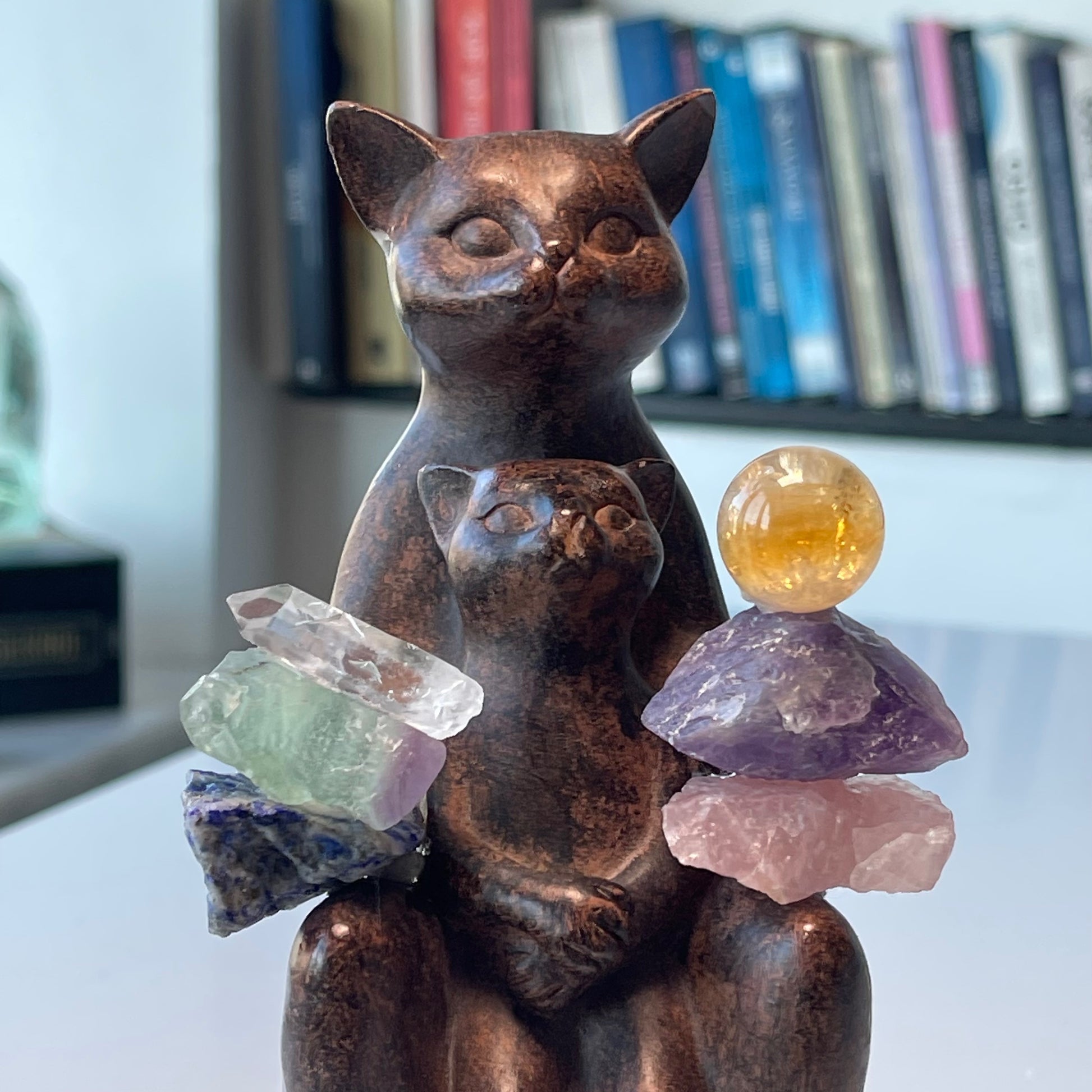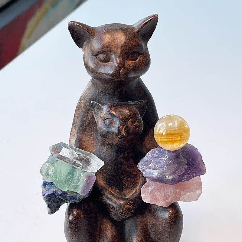 Anne kedi, yavrusunu kucağına almış ona kristal taşların mistik hiakyesini ve etkilerini anlatıyor.