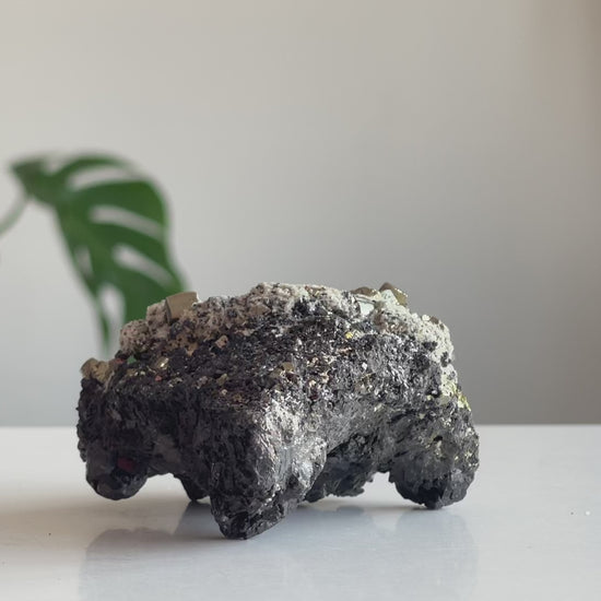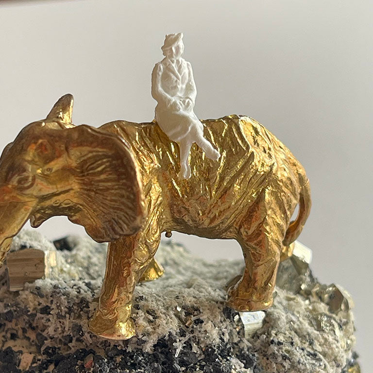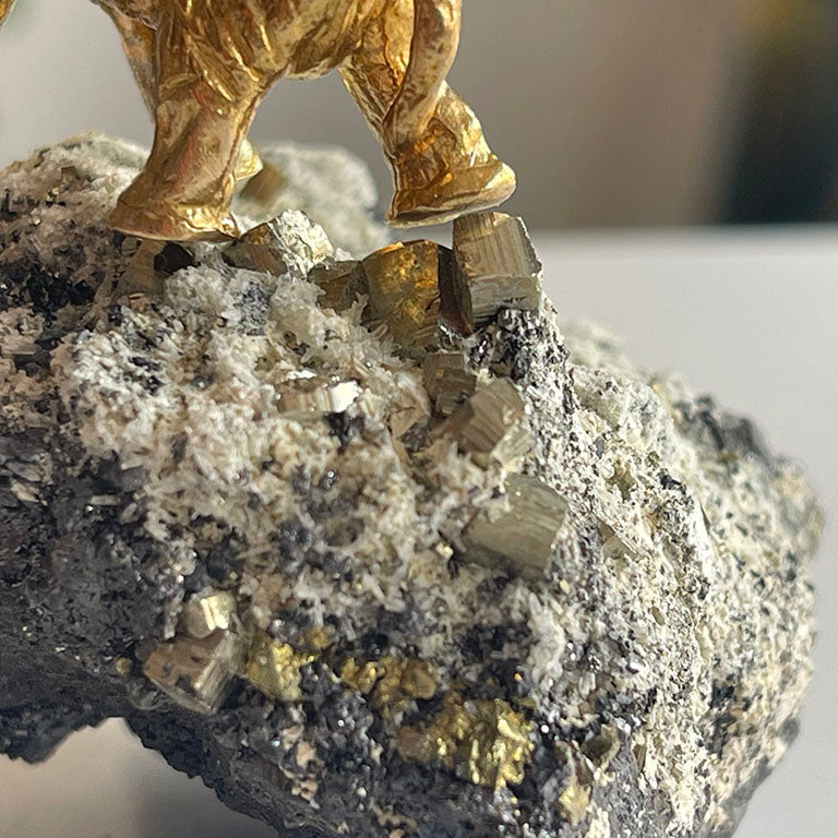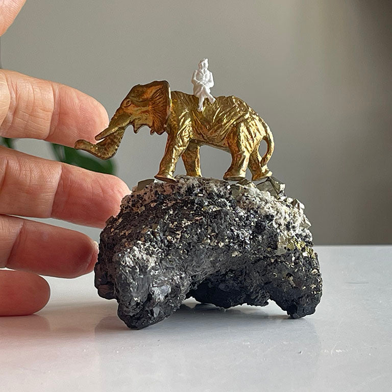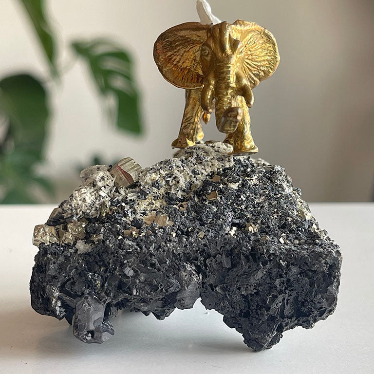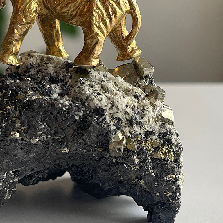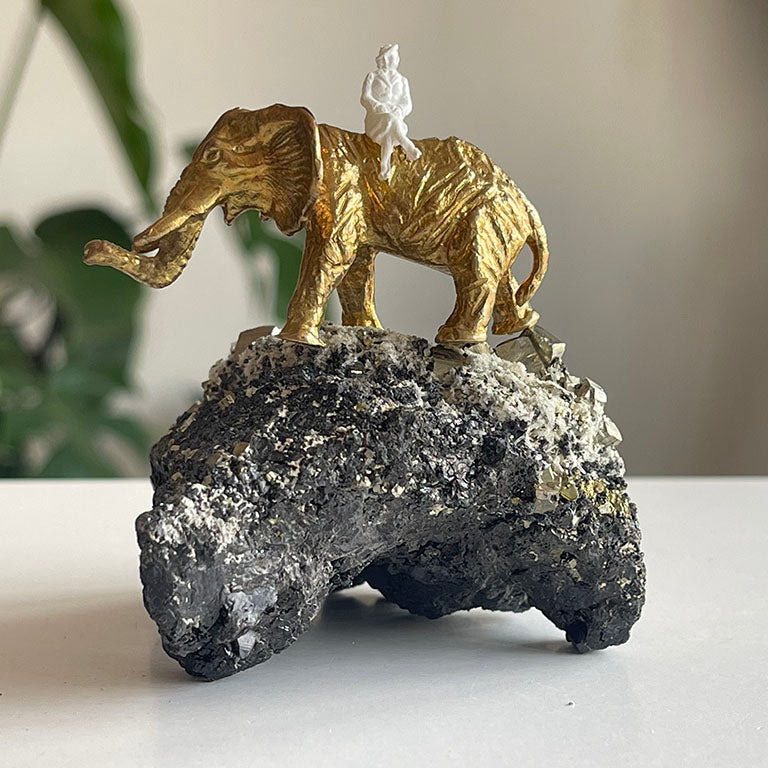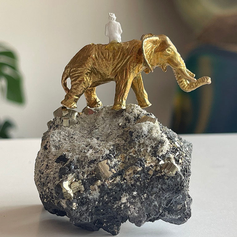 Pirit taşının keskin küp formunda parlayan yüzeyleri, adeta toprağın içinden fışkıran altın külçelerini andırır. Bu doğal yapı, bolluk ve bereketin simgesi olarak görülür. Üzerine oturtulmuş pirinç fil ve kadın figürü ise bu enerjiyi taşıyan bir hikâyeyi anlatır: Fil, dayanıklılığı ve bilgeliği simgelerken, kadın figürü sezgiyi, yaratımı ve hayatı kucaklamayı temsil eder.