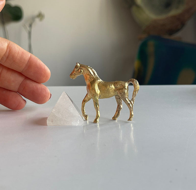 Selenit piramit, ışığı yumuşak bir huzura dönüştürür. Ortamı temizleme ve enerjiyi yükseltme özelliği vardır. Ayağını piramidin kenarına yerleştirmiş halde duran pirinç at figürü ise gücün ve özgürlüğün sembolüdür.