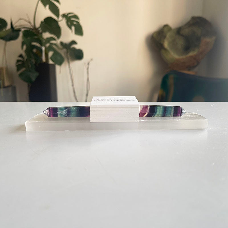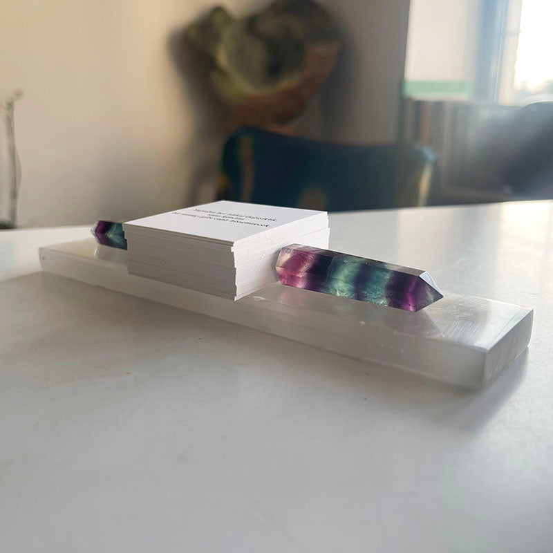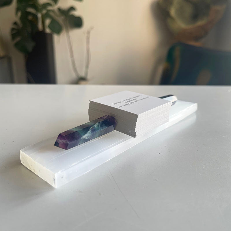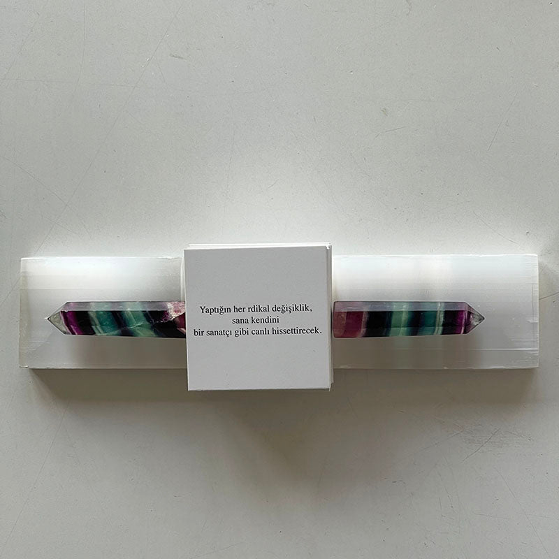 Selenit tabaka üzerinde yatay şekilde iki Florit kule bulunuyor. Florit, zihni toparlayarak odaklanma gücünü arttırır. Aynı zamanda mor ve yeşil tonların geçişiyle canlılık veren bir etki yaratır. Selenit ise alanı ağır enerjilerden temizler, ortamda hafif bir enerji yaratır. Kulelerin arasında duran günlük sorgulama kartları, kısa bir durma anı yaratmak için. Florit, zihnin dağılmadan kartta yazana odaklanmanı sağlayacak. Selenit ise bu odaklanmayı berrak bir zihne taşıyacak.