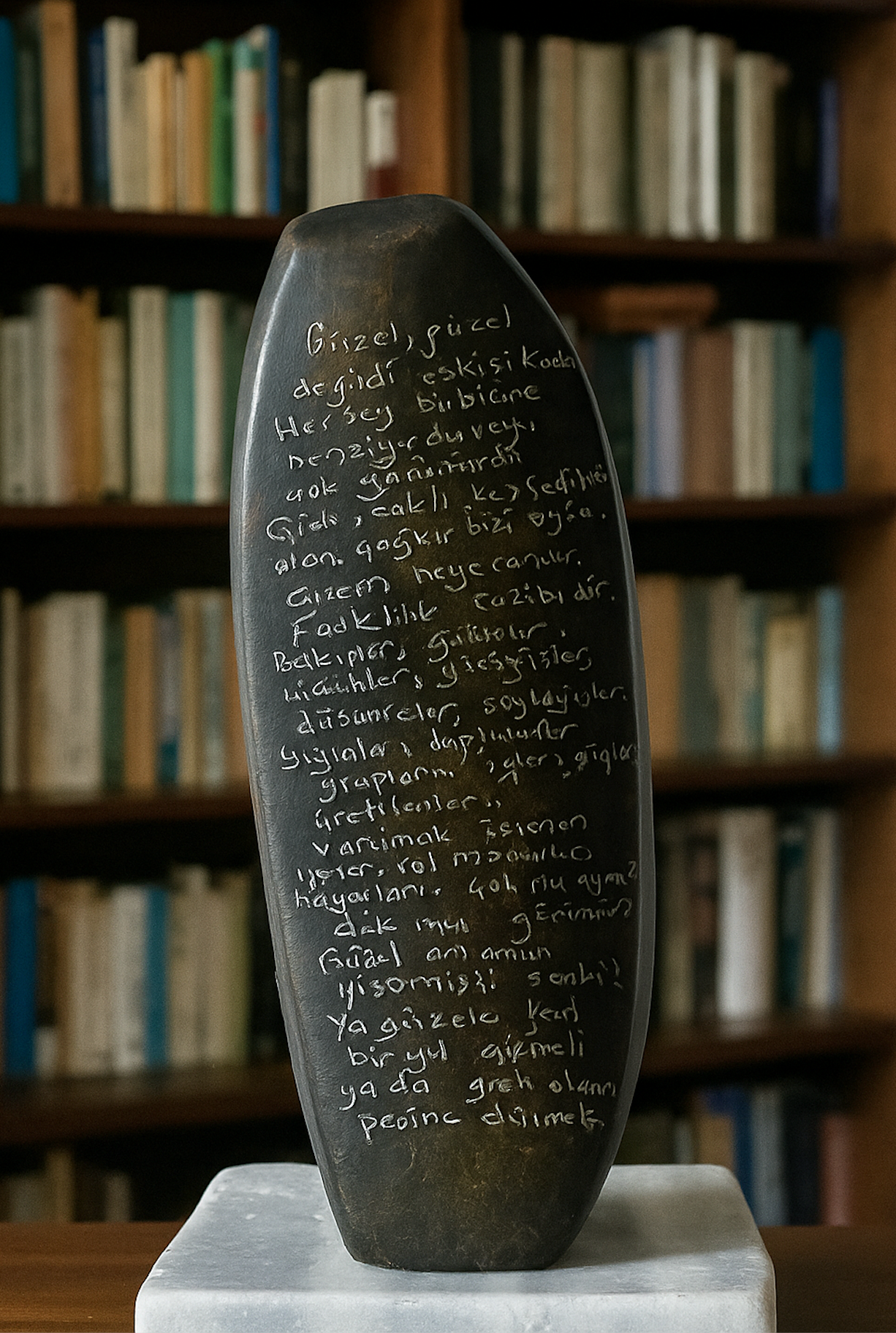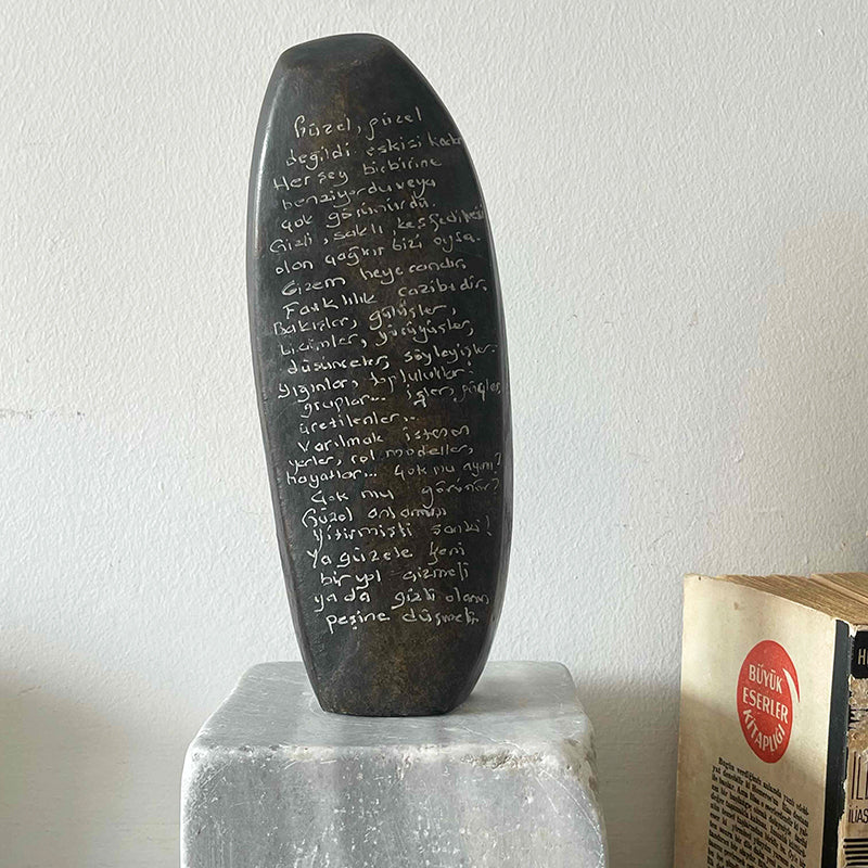 Heykelin arkasında, günümüzde her şeyin birbirine benzemesiyle ayrıştırmakta güçlük çektiğimiz güzelliğe gönderme niteliğinde bir metin bulunuyor ve bu yolla çift taraflı kullanabileceğiniz bir heykele dönüşüyor.