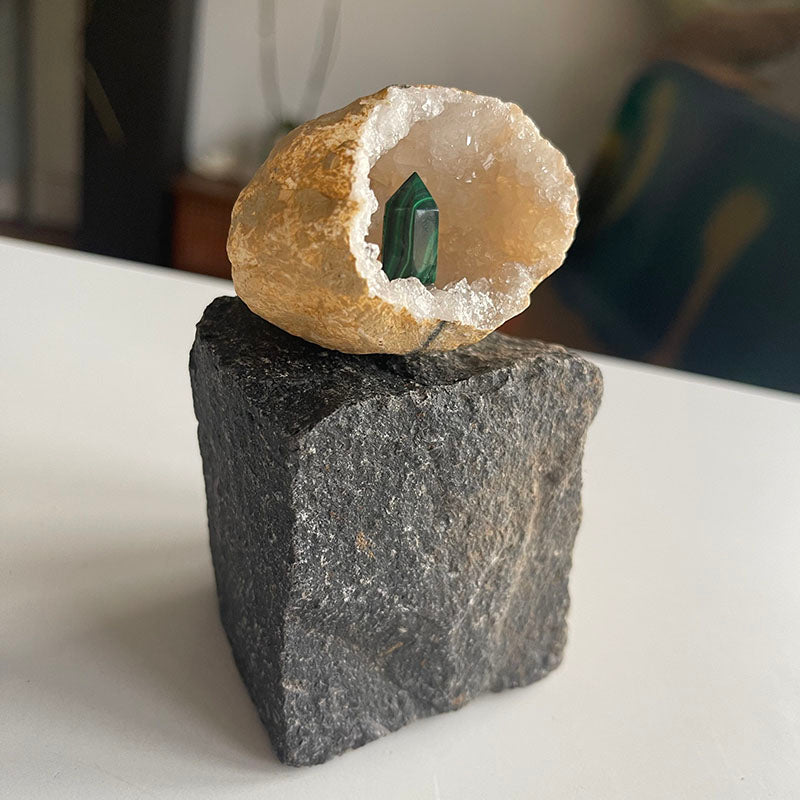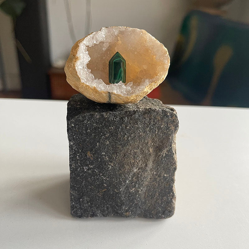 Kalsitin dış kabuğu ile içindeki parlaklık arasındaki fark, insanın kendi iç cevherini andırır. Dış görünüş çoğu zaman sade, hatta sıradan olabilir. Oysa içeride saklı duran berraklık, güç ve değer çok daha yüksektir. Malakit bu hikayeyi tamamlar. Yeşilin derin tonu koruyucu, dönüştürücü ve kararlı bir enerji taşır. Bu küçücük kulenin mağaranın kalbinde durması, insanın içindeki cevherin kabuğun altında büyüdüğünü hatırlatır.