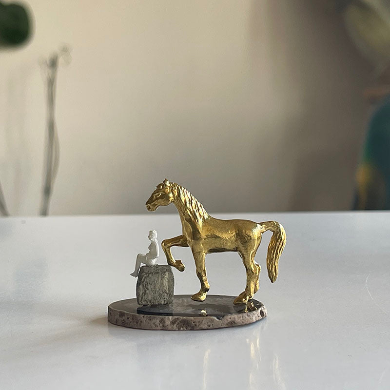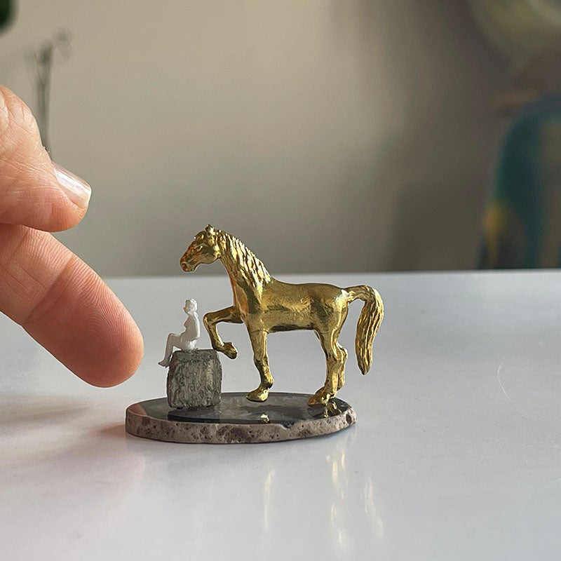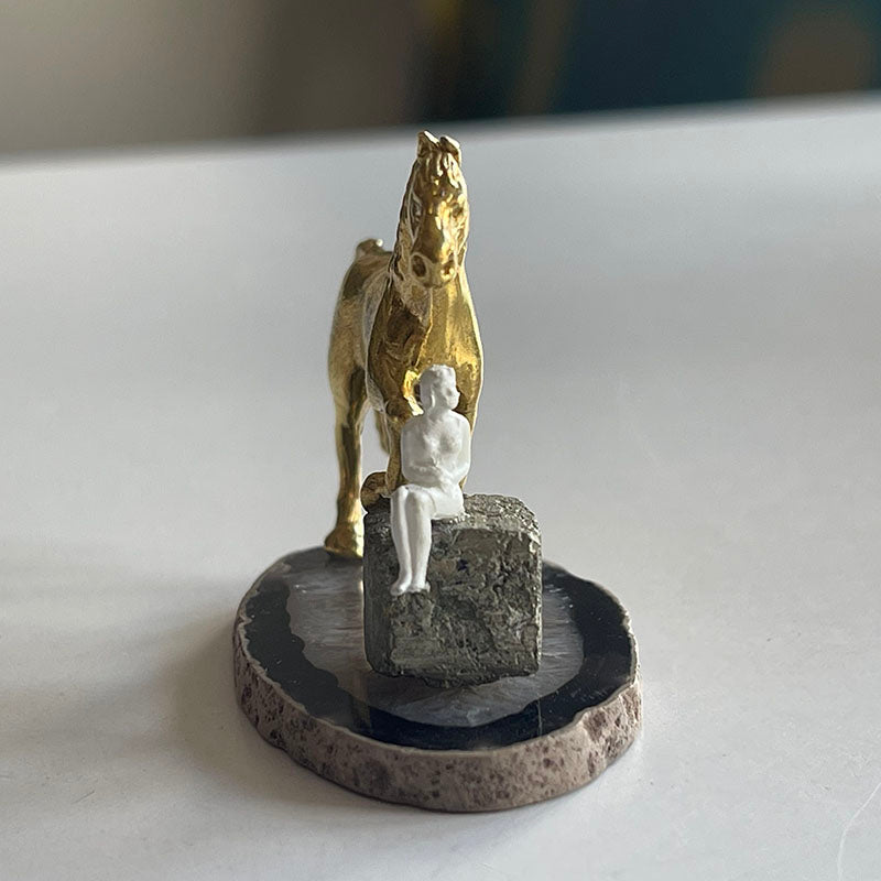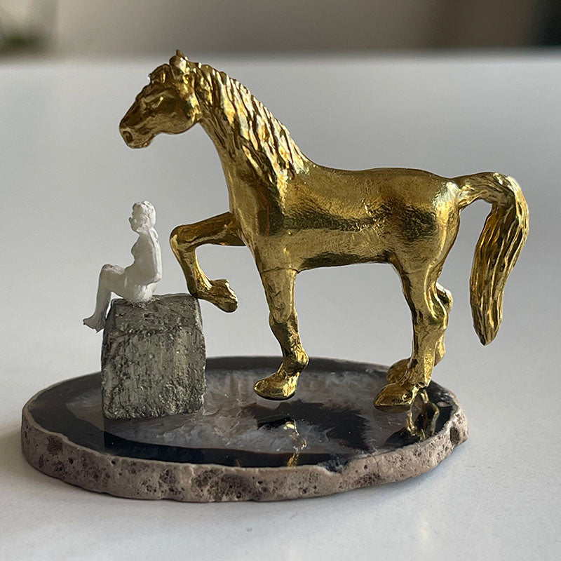 Siyah ve gri tonlardaki ince Akik zemin üzerinde kpü formunda Pirit taşı, üzerinde oturan bir kadın ve piriç at figüründen oluşan bu çalışma, minyatür boyutu ile oldukça çekici.