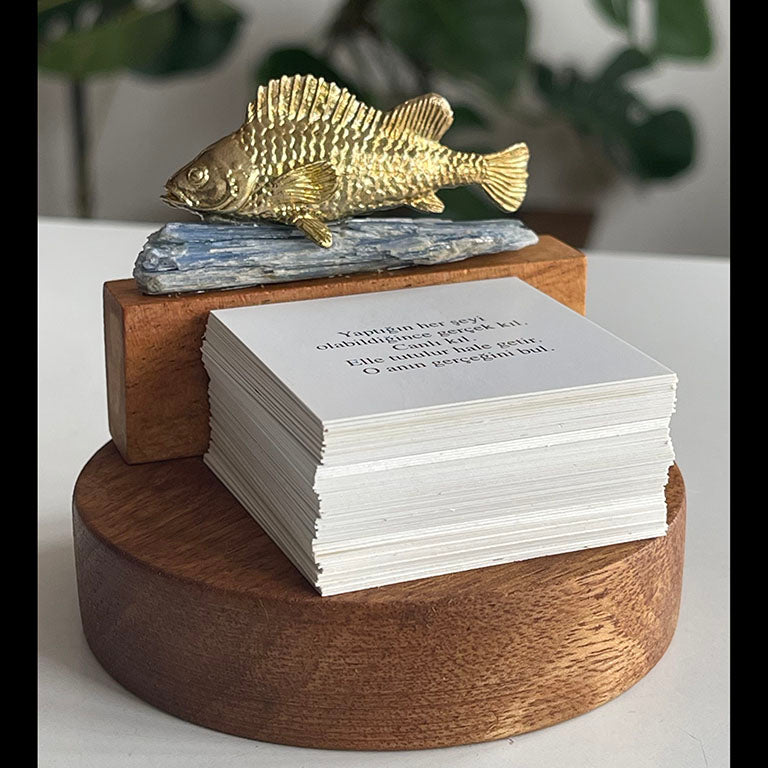 Ahşap kaidesi üzerinde mavi Kyanit taşı ve pirinç balık figürü bulunan bu obje, sezgisel rehberlik ve içsel dengeyi destekleyen bir enerji alanı yaratır. Kartlar ise, düşünsel bir ayna görevi görür. Kararsız kaldığınızda, yönünüzü şaşırdığınızda ya da bir konuda ilham aradığınızda bir kart çekip üzerine düşünebilirsiniz. Bu ritüel, zihni susturup kalbinizin sesini duymanız için tasarlanmıştır.