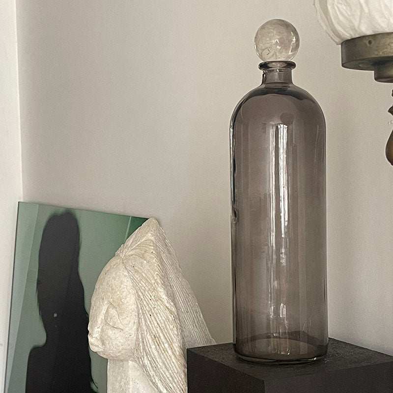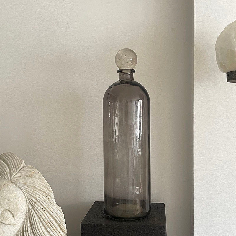 Kristal Kuvars küre, gri dekoratif şişenin kapağı görevini görür. Bu ikili, yaşam alanınıza sade ve stilize bir şıklık katarken, aynı zamanda bulunduğu ortamın enerjisini yükseltir.