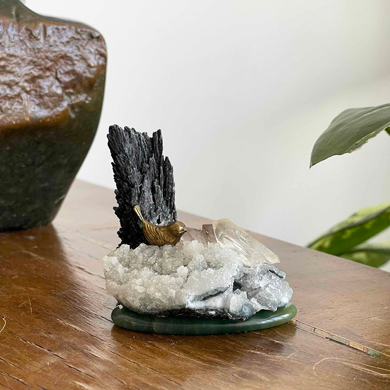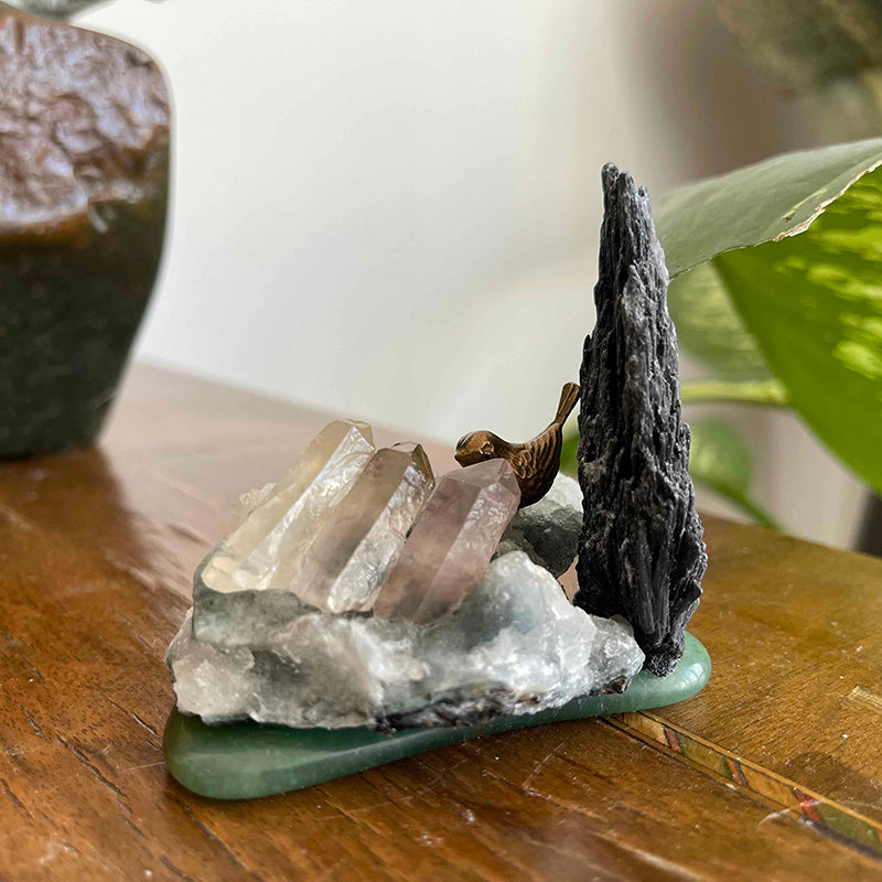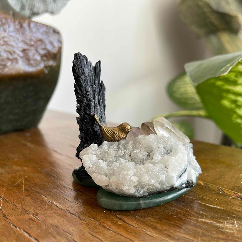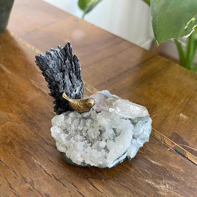 Aventurin kaide üzerinde bulut görünümlü Apofilit kristali ile Dumanlı Kuvars ve Kristal Kuvarslar. Siyah kanat formunda Kyanit taşı ve pirinç kuş figürü. Kuş yuvasını sembolize eden bu çalışma, yuvanıza huzur ve temizleyici yüksek enerjiler getirmesi için tasarlandı.