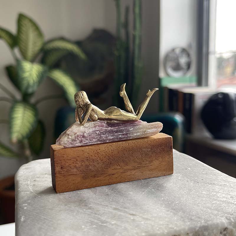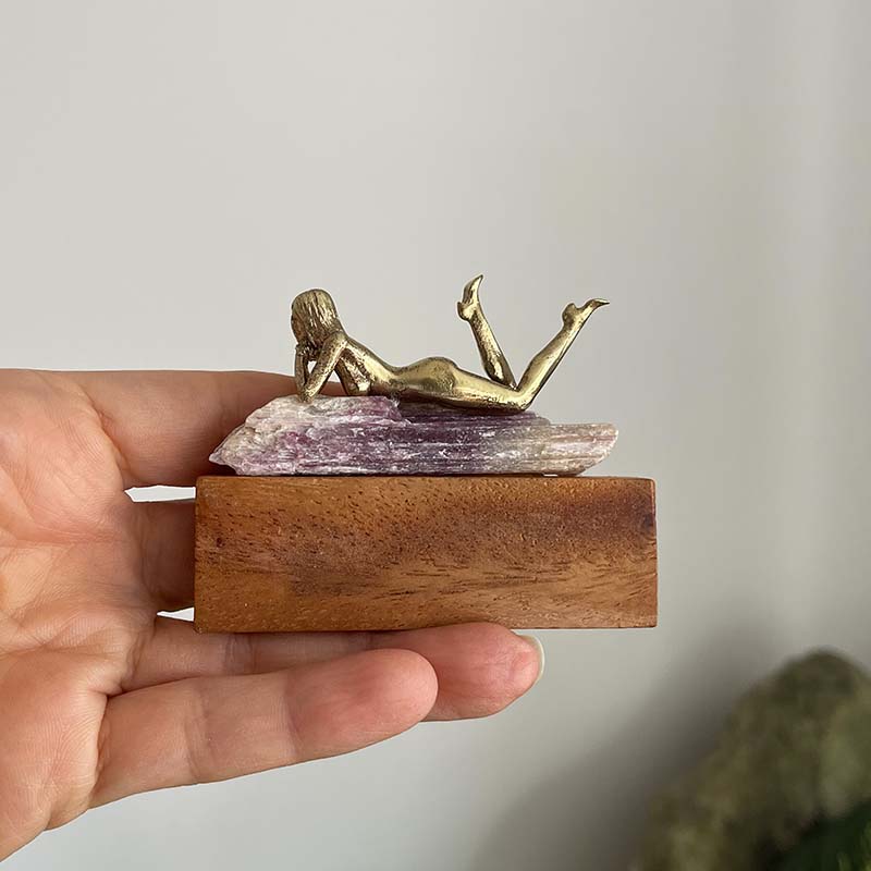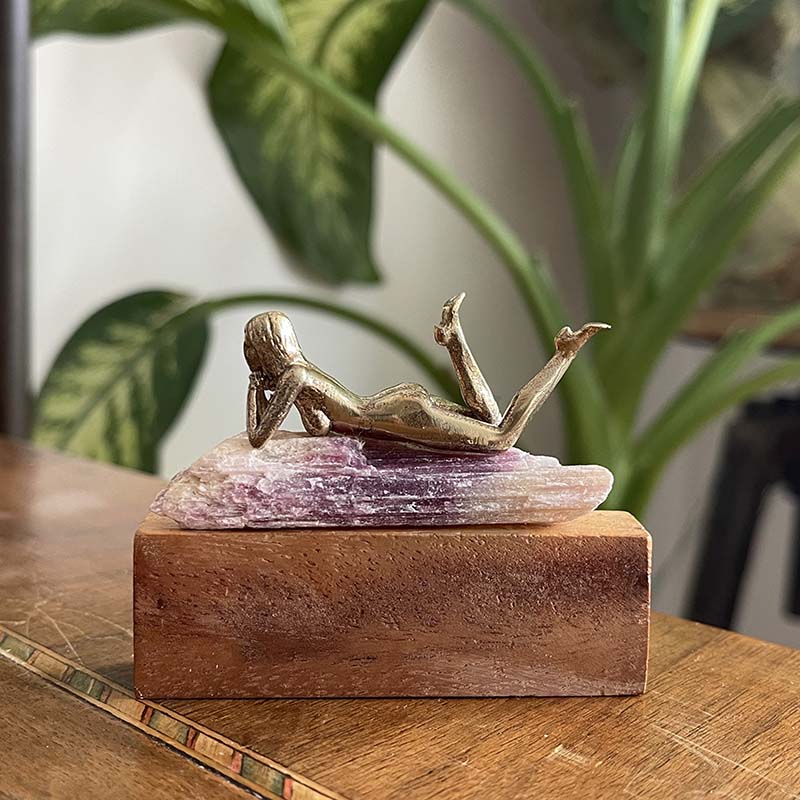 Ahşap blok üzerine yerleştirilmiş Pembe Turmalin, kendine has enerjisiyle adeta duygusal şifanın sembolüdür. Üzerindeki zarifçe uzanmış kadın figürü ise, doğurganlığın, içsel gücün ve duygusal denge arayışının ifadesi.