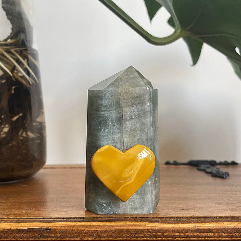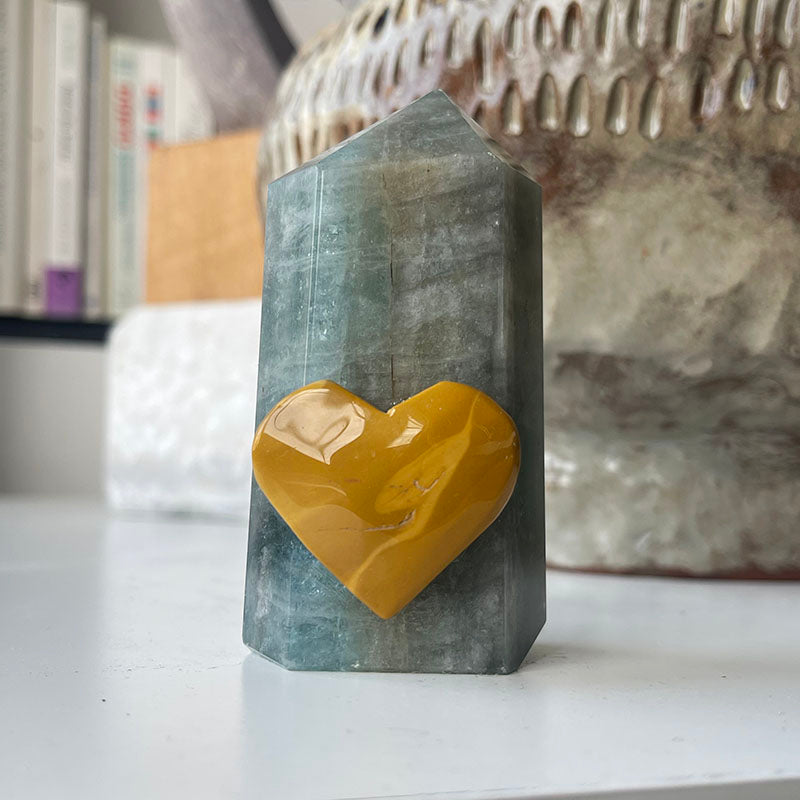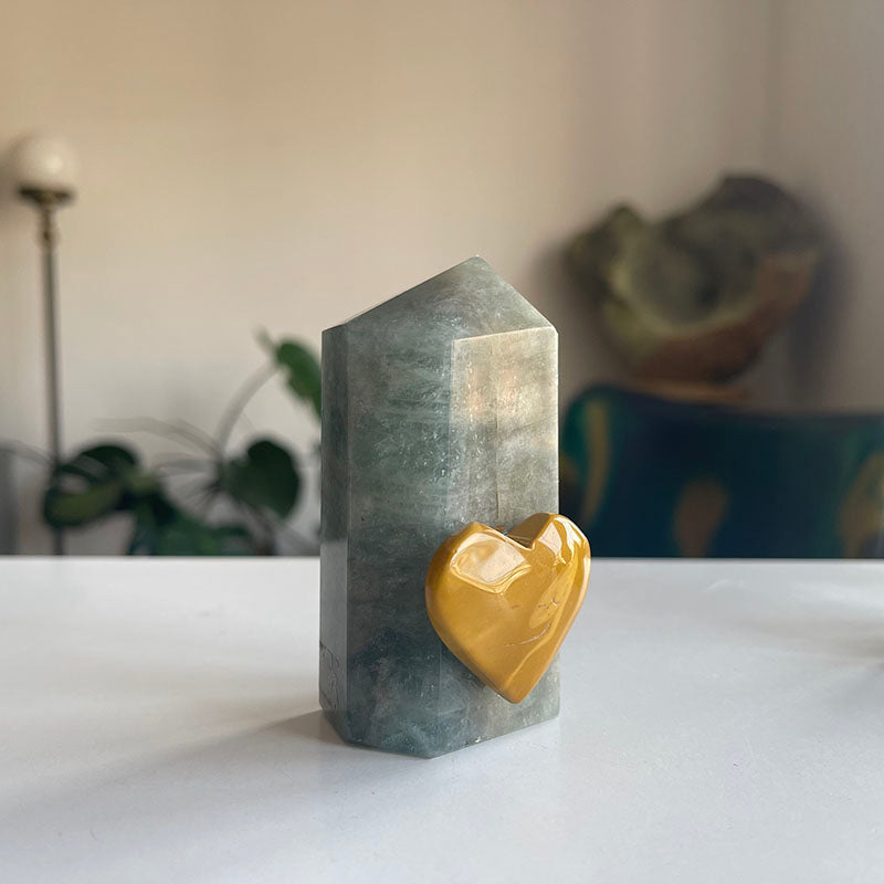 Kulenin üzerine yerleştirilmiş kalp formundaki sarı Akik, yaşam sevincinin ve özgüvenin simgesidir. Güneş enerjisini taşır. Kalbi ısıtır, içsel cesareti besler. İrade gücünü artırırken aynı zamanda neşeyi ve canlılığı hatırlatır.