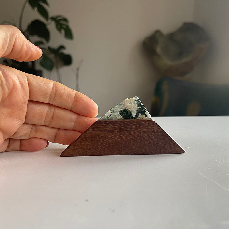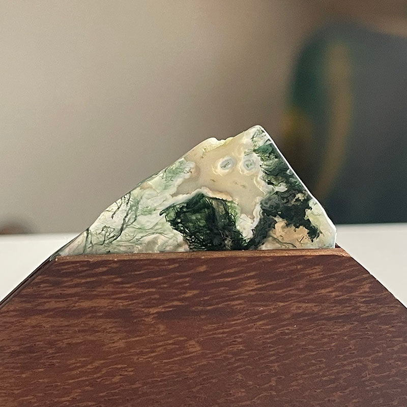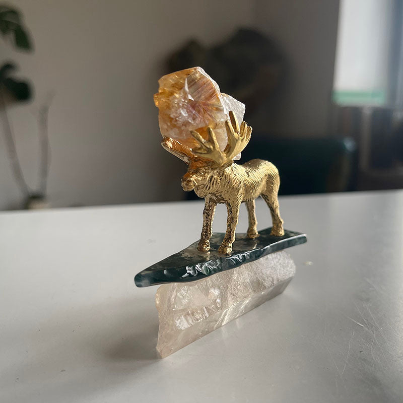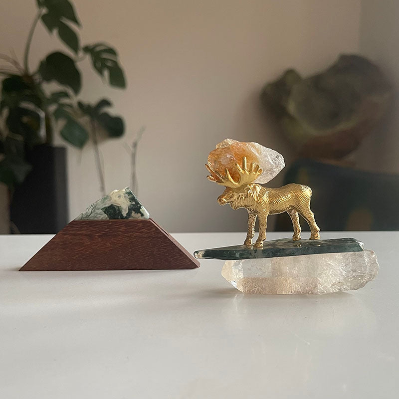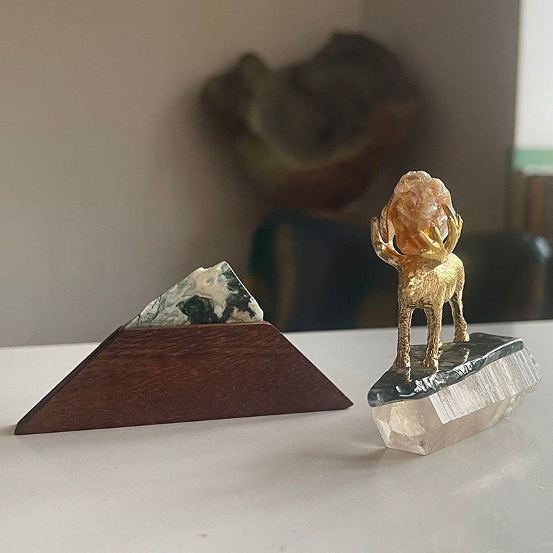 Ahşap aparat üzerinde duran yarı saydam Yosun Akik, içinden süzülen ışıkla dağ silueti hissi yaratıyor. Doğal sakinlik, yükselme isteği ve içsel berraklık aynı yüzeyde buluşuyor. Hemen yanında Lodolit Kuvars üzerinde ince bir yosun akik daha yer alıyor. Üstünde, boynuzlarında Sitrin kristali taşıyan pirinç geyik figürü duruyor.