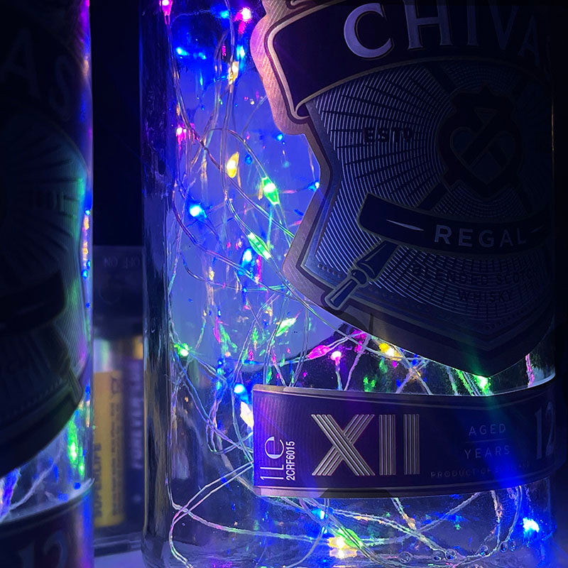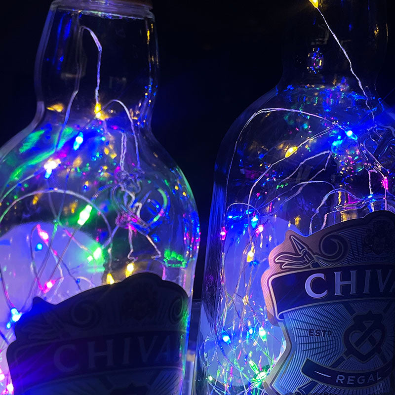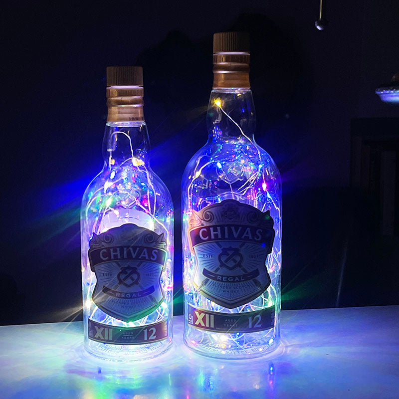 İki adet viski şişesi, içine yerleştirilen pilli ışıklarla mini bir yılbaşı şovuna dönüşüyor.