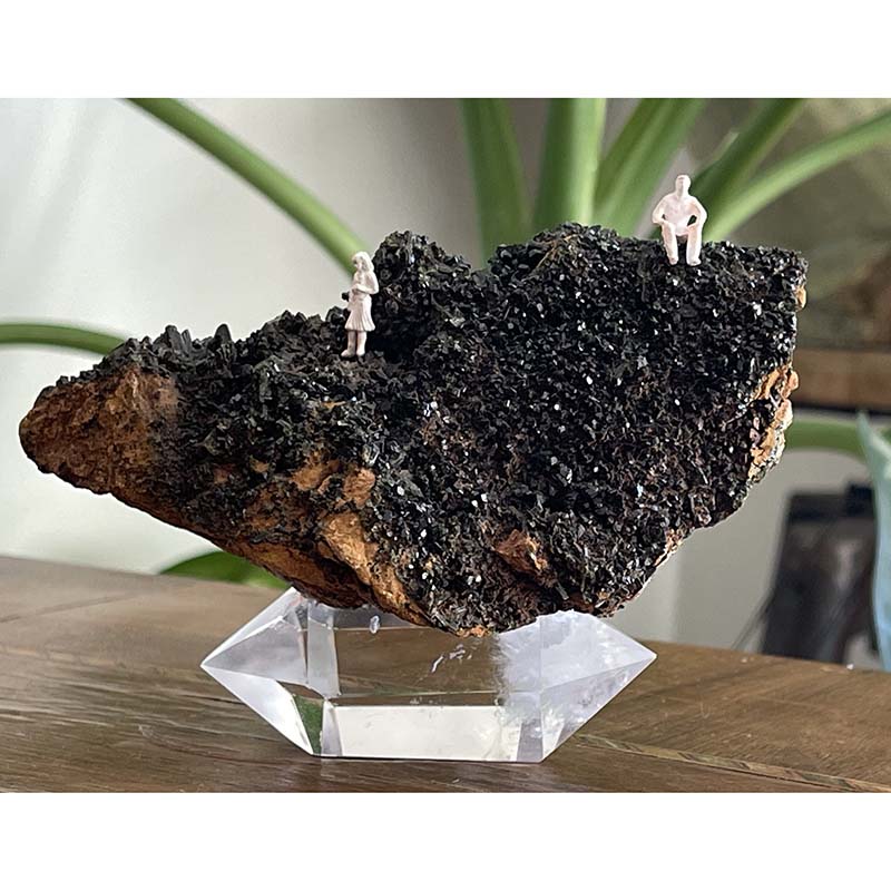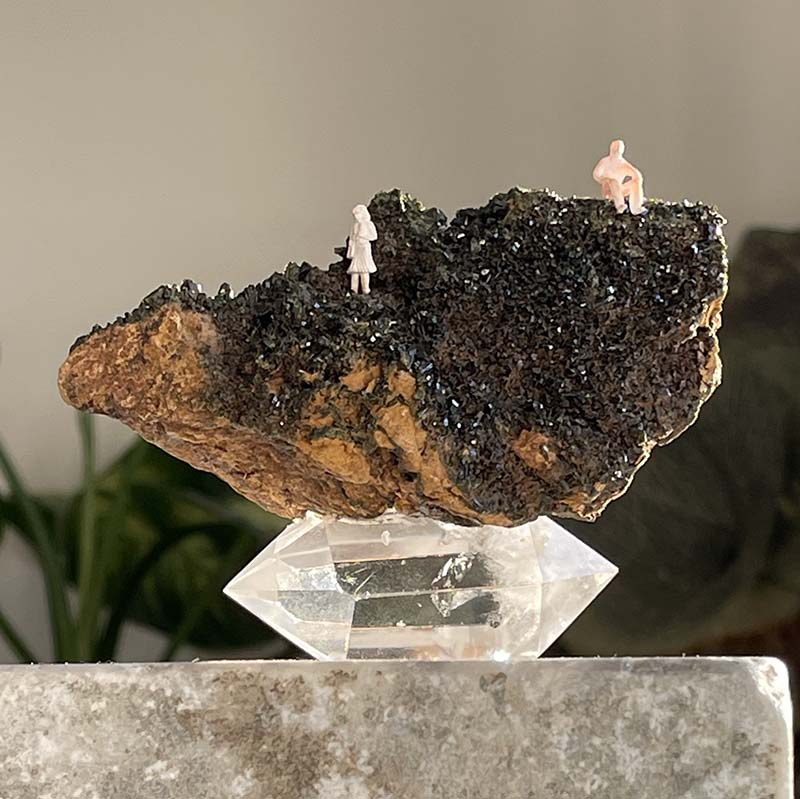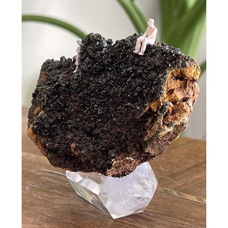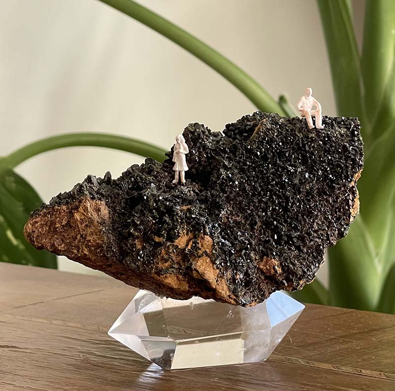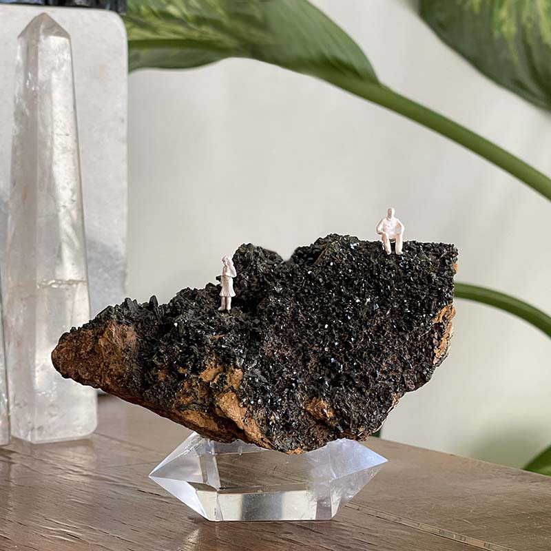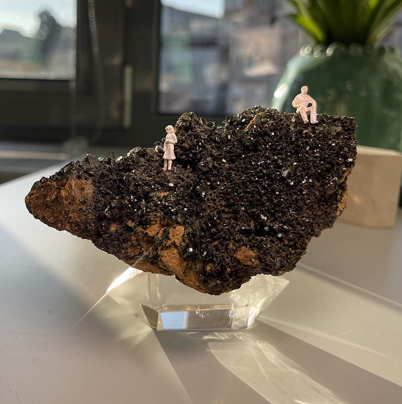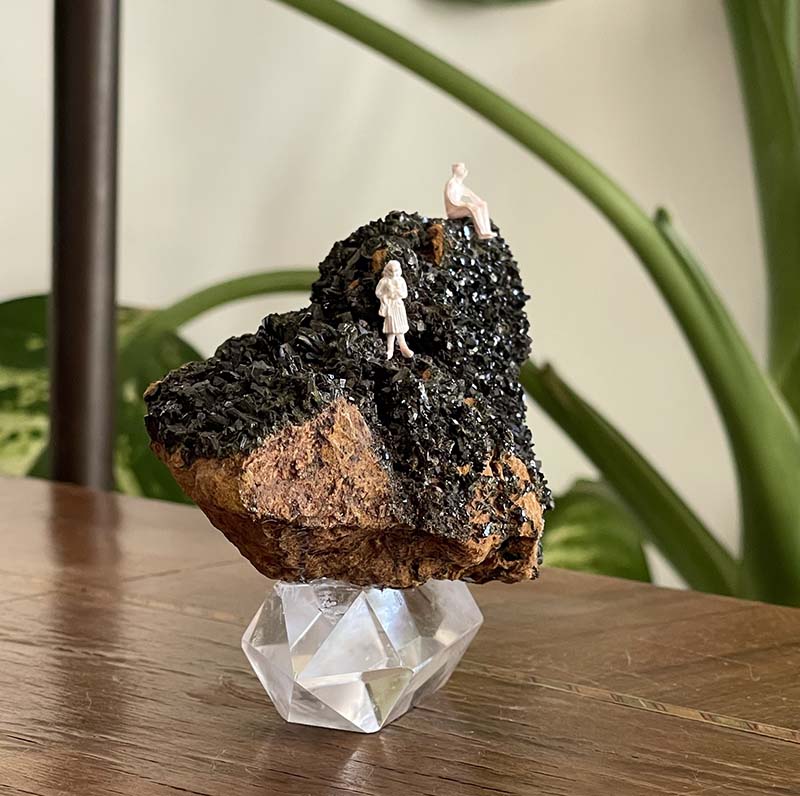Hematit kayasındaki siyah tonlar, geçmişin verdiği ağırlıkları simgeler. Bu taş zamanın izlerini taşırken kayanın bir ucunda oturan adama geçmişin derinlerini hatırlatır. Hematit'in altında bulunan Kristal Kuvars ise; berrak, saf ve geleceğe dair umut verici bir ışık ve etki yayar. Adamın biraz ilerisinde, sırtı ona dönük düşüncelere dalmış bir kadın vardır.