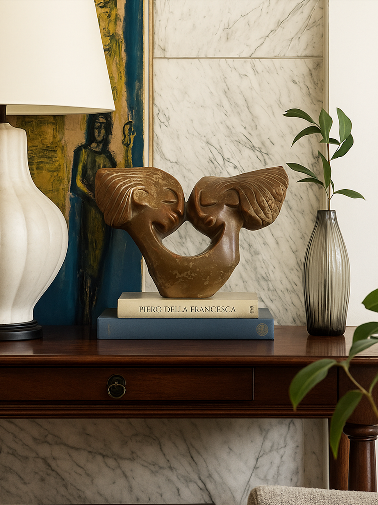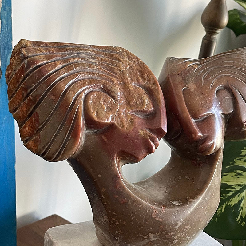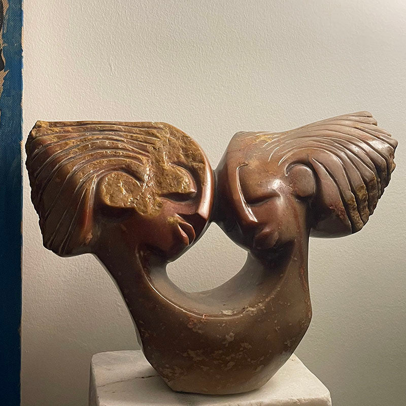 Zimbabwe’nin Shona sanatçılarından Charles Manyaure elinden çıkan bu taş heykel, derin bir anlam ve estetik taşıyor. Tek bir beden üzerinde, birbirine dönük ve gözleri kapalı iki kişi olarak tasarlanmış bu eser, hem bireyin kendi iç dünyasında, kendinden kendine yaptığı manevi yolculuğu, hem de bir çiftin tek bir beden gibi uyum içinde birleşmesini sembolize ediyor. İki bakış açısıyla da yorumlanabilecek şekilde tasarlanmış oluşu ile sanatçının farklı stilini sergiliyor.