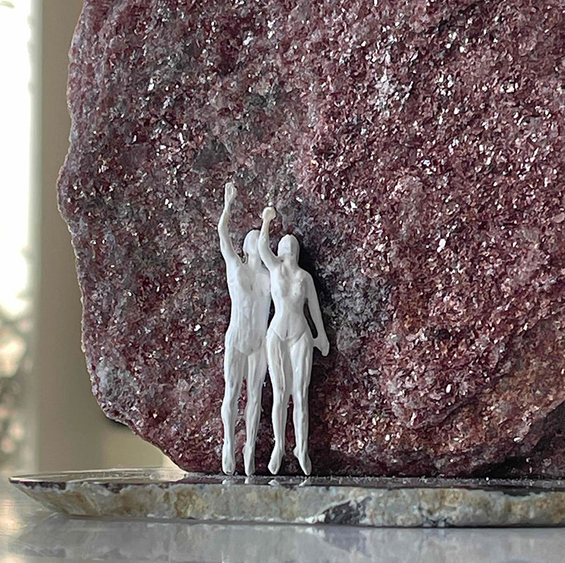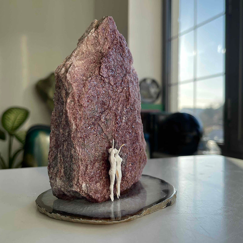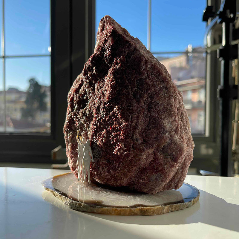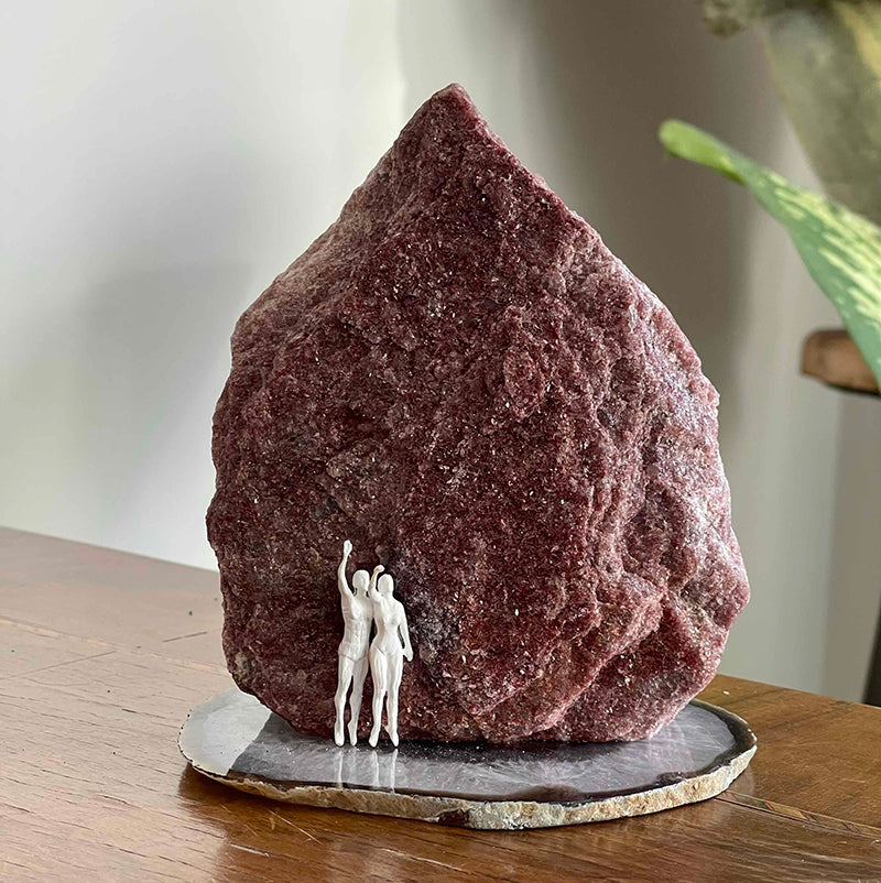 Akik kristali üzerinde kendinden ışıltılı Pembe Fuksit kaya parçası.. Kayanın önünde gökyüzündeki yıldızlara bakarak, aşk yazan bir çift...