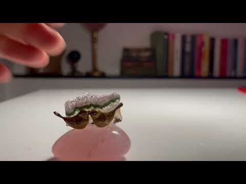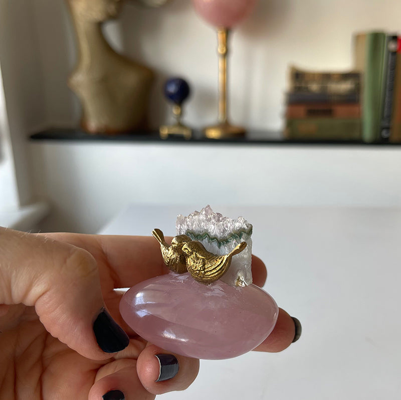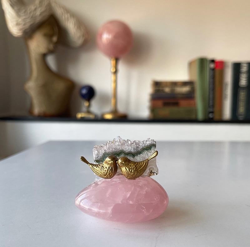 "Aşkın Dansı," oval formda Pembe Kuvars'ın üzerinde yükselen Ametist kristali ve önünde pirinçten öpüşen iki kuş figürüyle özelleştirilmiş bir tasarımdır. Bu eser, hem kristallerin etkisiyle pozitif enerjiler yayar, hem de dekoratif bir güzellik sunar.