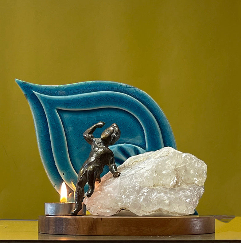 Bu eser, evinize zarif bir dokunuş ve göz alıcı bir dekoratif parça olarak hizmet vermek aynı zamanda Ay Taşı kristalinin etkilerinden faydalanmanız için tasarlandı. Yanında yer alan mum, kompozisyonu romantik bir atmosfere dönüştürecek ve evinize sıcak bir ışık katarak rahatlamanıza yardımcı olacak.