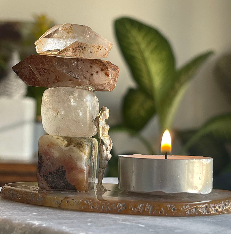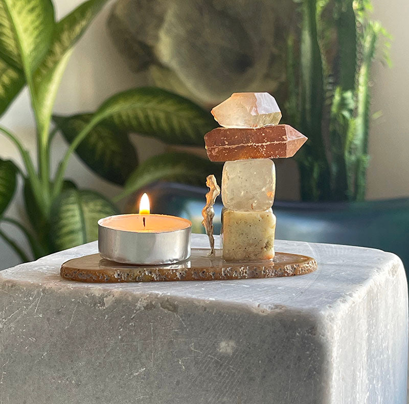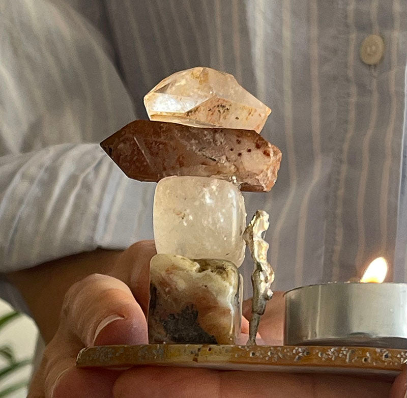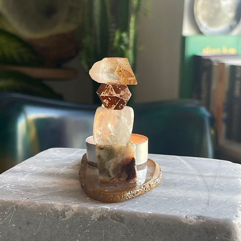 Akik tabaka üzerinde yükselen Amazonit ve Kristal Kuvars'ın küp formu, hayatın sağlam ve dengeli yönlerini temsil eder. Üzerindeki ham Portakal Kuvars ise canlılık ve yaratıcı enerjiyi yansıtır. Bu kristallerin birleşimi, huzuru, berrak düşünceyi ve içsel gücü destekler.