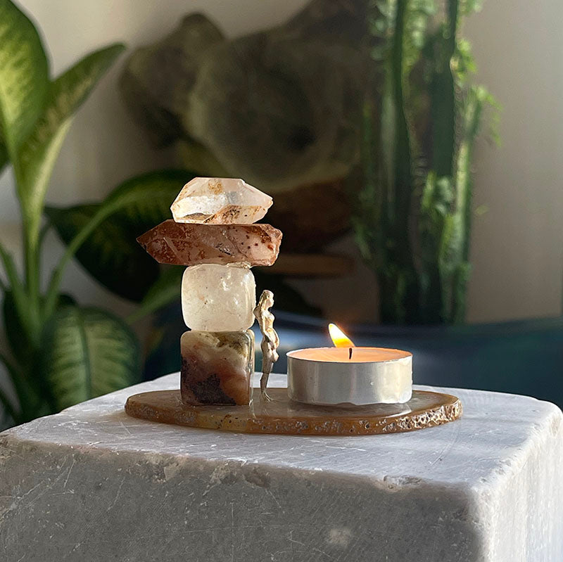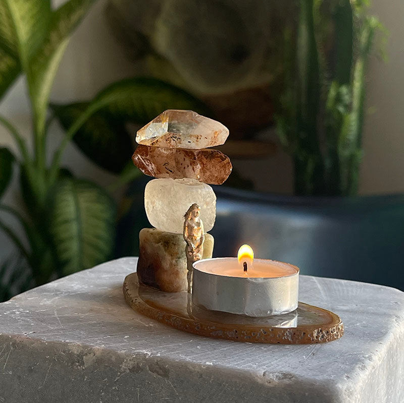 Kulenin önünde duran kadın figürü, ışığa doğru duruşuyla aydınlanmayı simgeler. Önündeki tealight mum, zihinsel ve ruhsal aydınlanma yaşamasını sağlayan bilgi ve deneyimlerin sembolüdür.