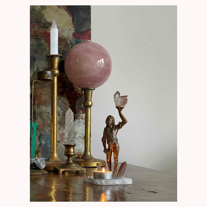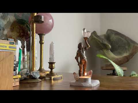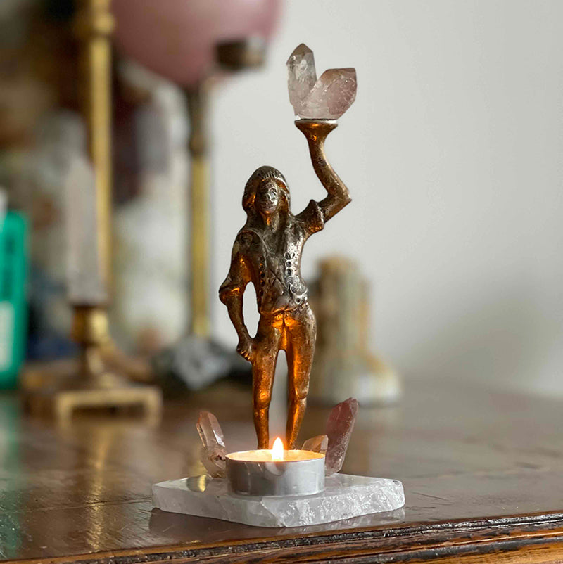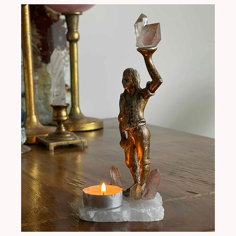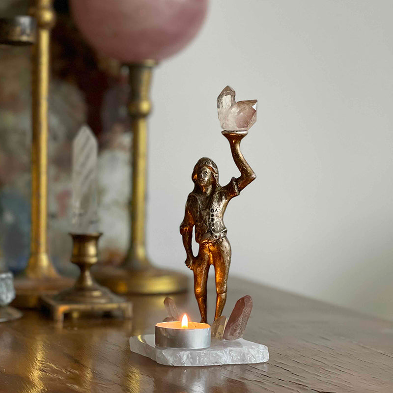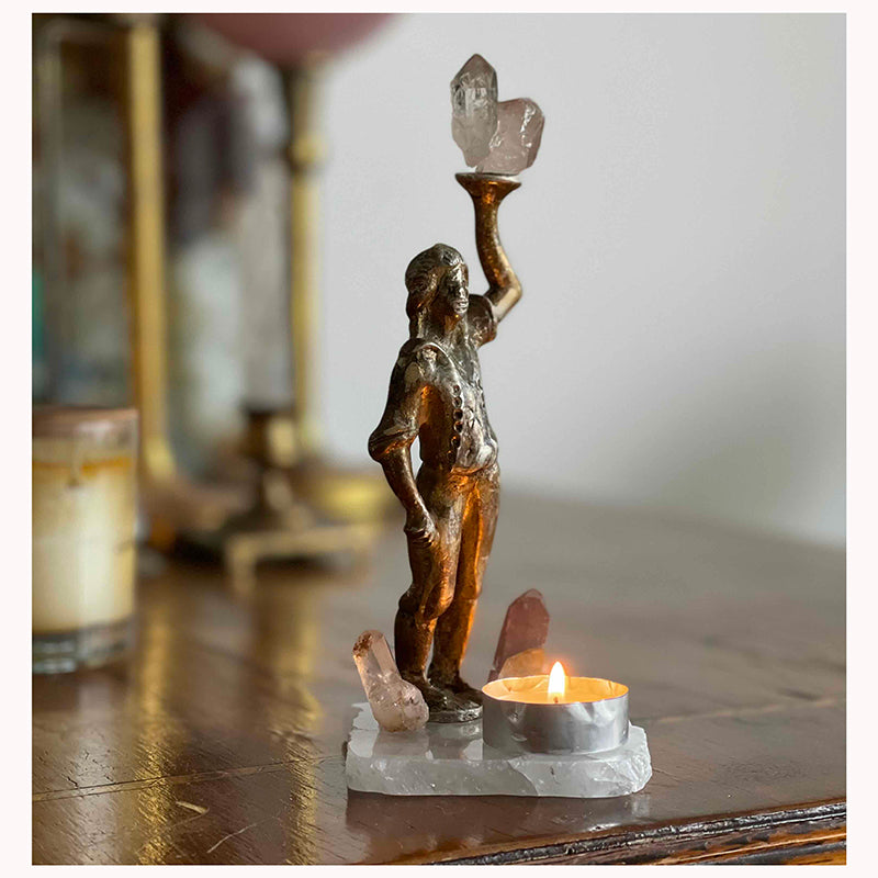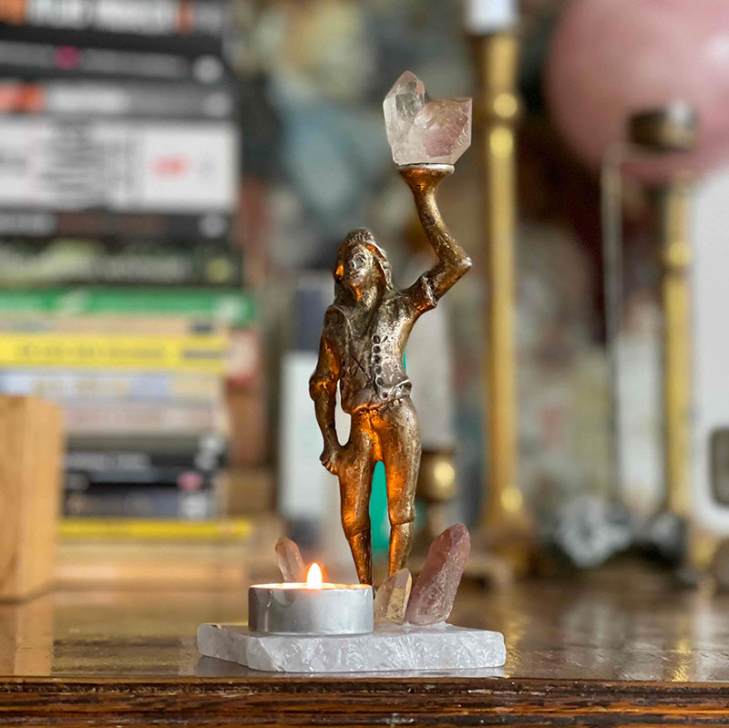 Kristal Kuvars tabaka üzerinde pirinç figür, elinde meşaleyi sembolize eden Dumanlı Kuvars taşıyor. Ayaklarının dibinde yine Dumanlı Kuvarslar ile...