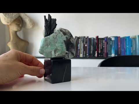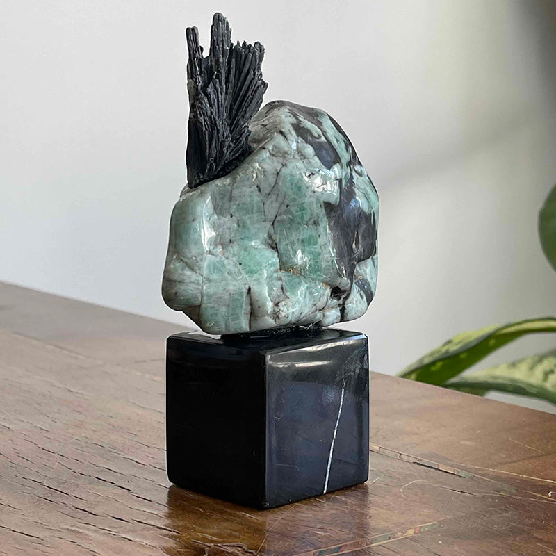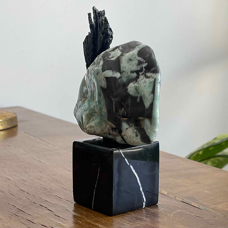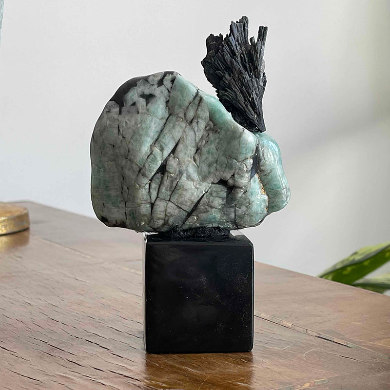 Siyah taş kaidesinin üzerinde Zümrüt kristali ve Zümrtü'ün başının üstünde kanat formunda bir Kyanit parçası..