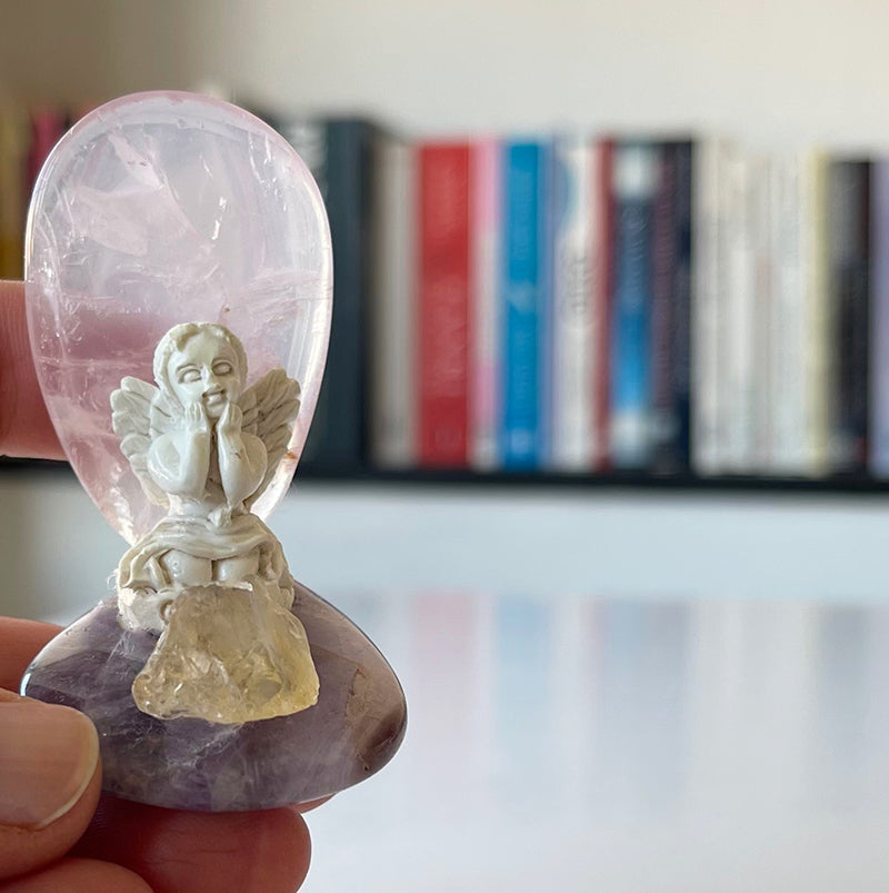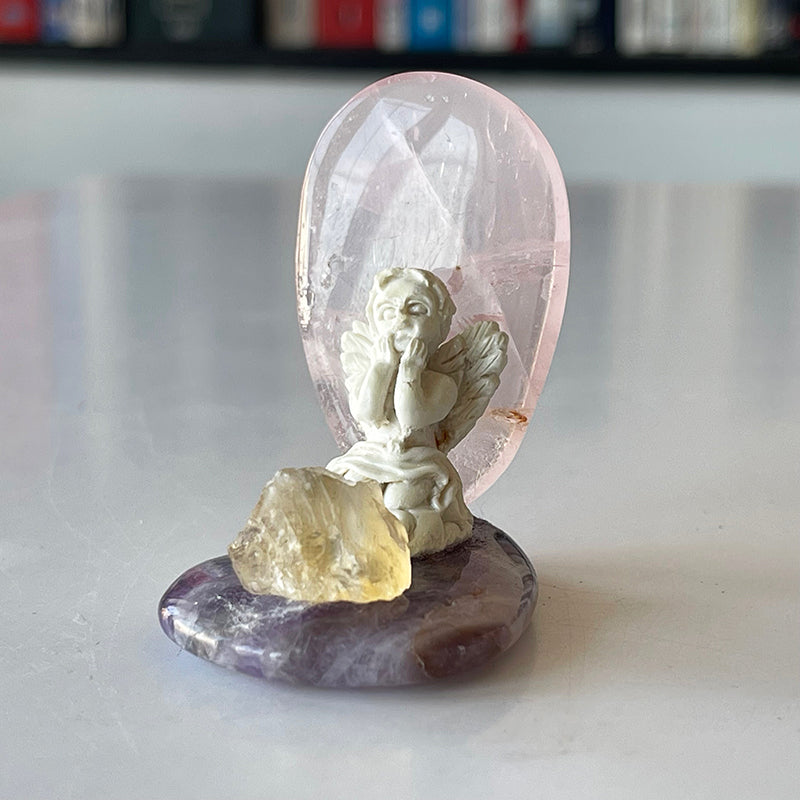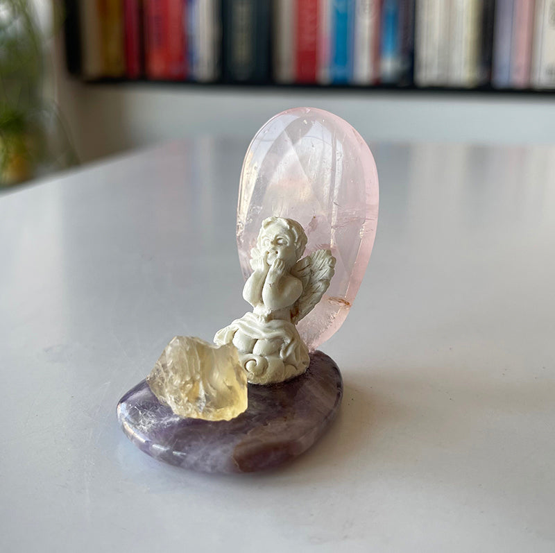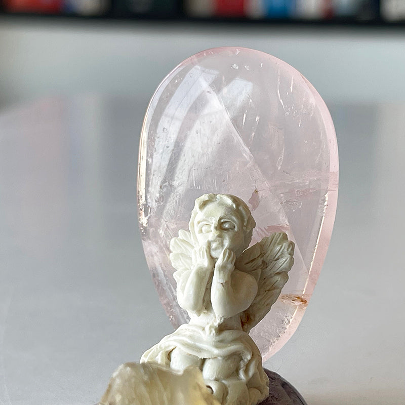Meleğin üzerinde oturduğu Ametist, meditasyon ve zihinsel netlik için mükemmel bir taştır. Arkasında bulunan Pembe kuvars sevgi ve şefkati temsil eden güçlü bir kristaldir. Evinizin enerjisini sevgi dolu bir atmosferle doldurur. Pembe kuvarsın yumuşak titreşimleri, evinizde hoşgörü ve uyumun hâkim olduğu bir ortam yaratır.