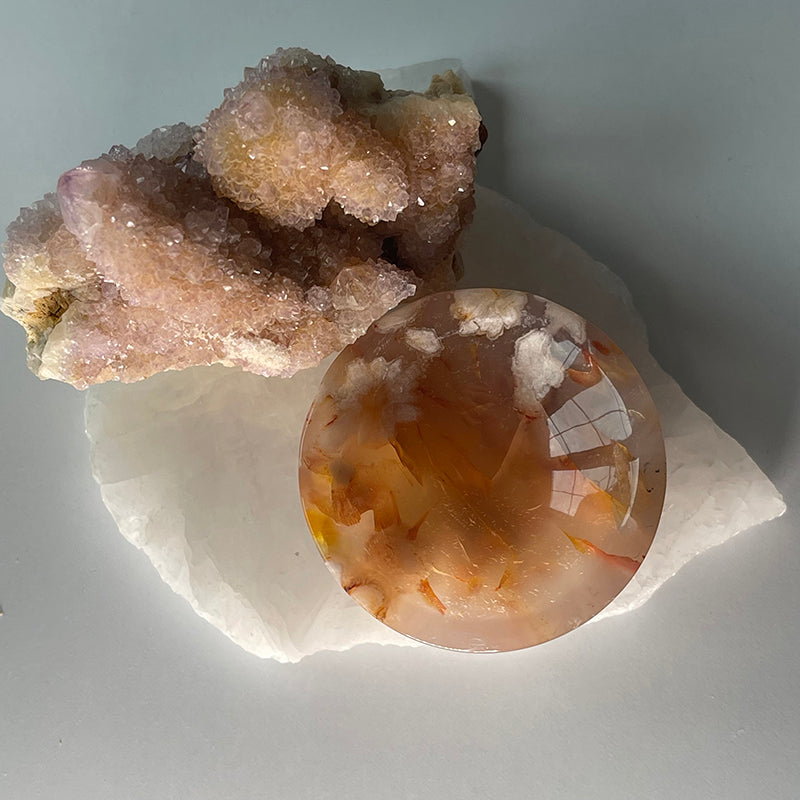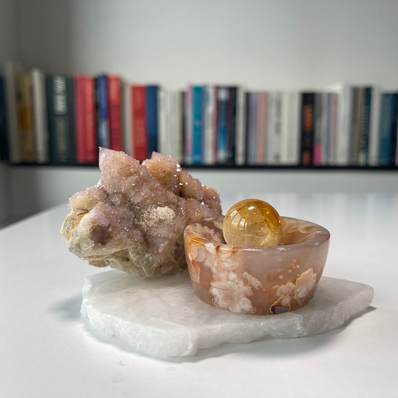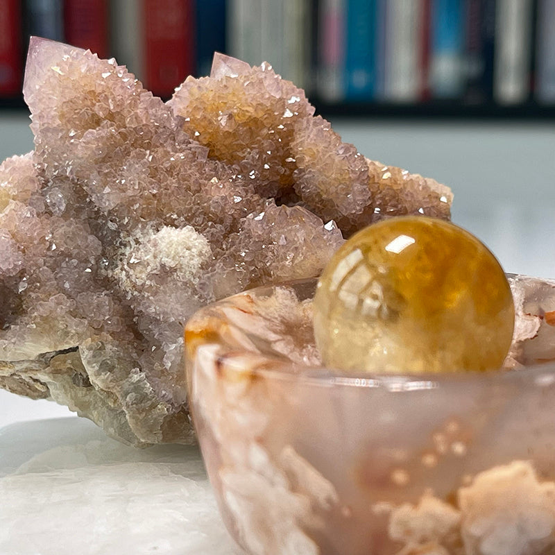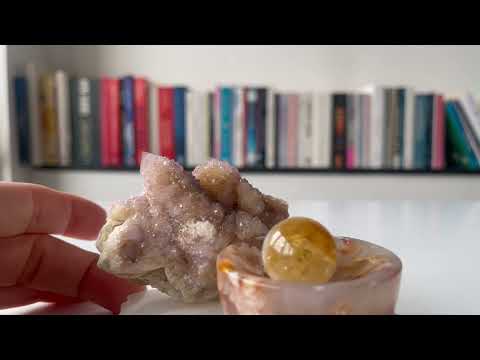 Eflatun tonlardaki Kaktüs Ametist Kristali bulunduğu ortama ve kişiye sakinlik sağlar. Aynı zamanda kişinin ve ortamın aurasını temizler. Taç çakraya ait bir taştır ve zihnin yaratıcılık kısmını açtığına inanılır. (Bu çalışmadaki kaktüs quartz koleksiyon parçasıdır)