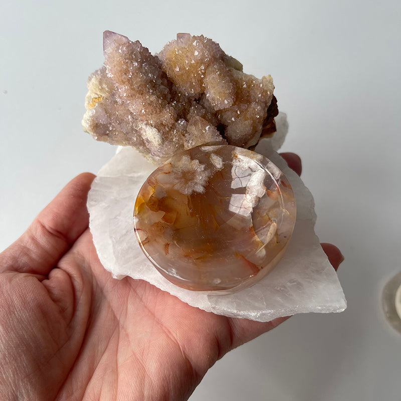 Alttaki tabaka halde Kristal Kuvars aura temizleme özelliği ile huzur verir, kaygılardan arındırır, motivasyonu ve frekansı yükseltir.