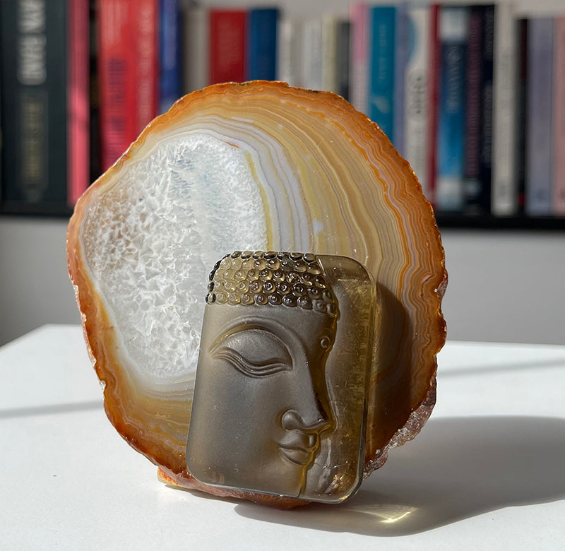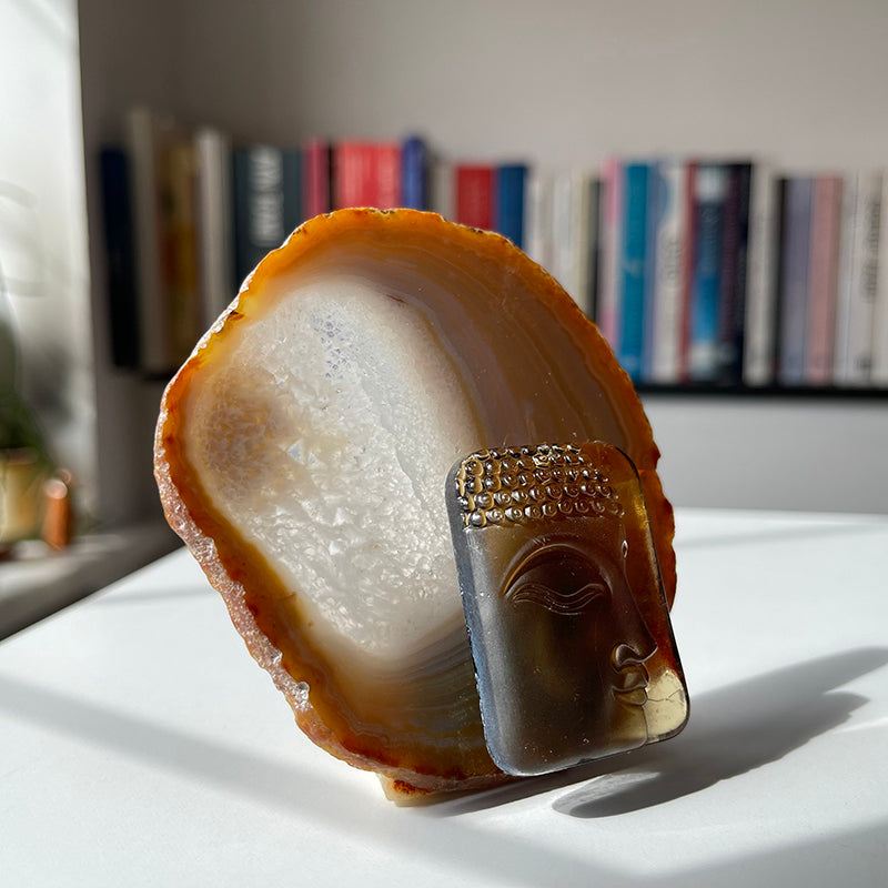 Buda'nın öğretileri ve doğanın enerjisiyle bütünleşen bu heykel, Akik, Kristal Kuvars ve cam Buda figürünün birleşiminden oluşur.