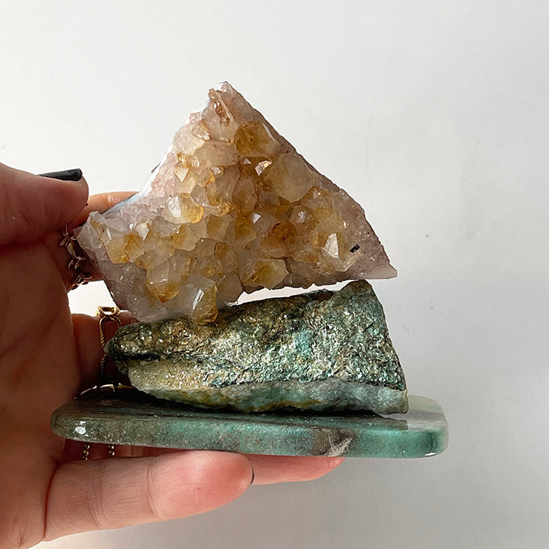 Her bir detayı titizlikle düşünülmüş, el yapımı bu dekoratif tasarım, doğanın kucağını evinize getiriyor. Her taşın özgünlüğü ve enerjisi, tasarımınıza benzersiz bir dokunuş katıyor. Bu parça, sadece bir dekorasyon öğesi değil, aynı zamanda sanatın ve doğanın birleşimini yansıtan bir tasarım.