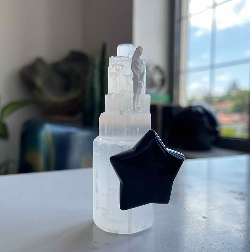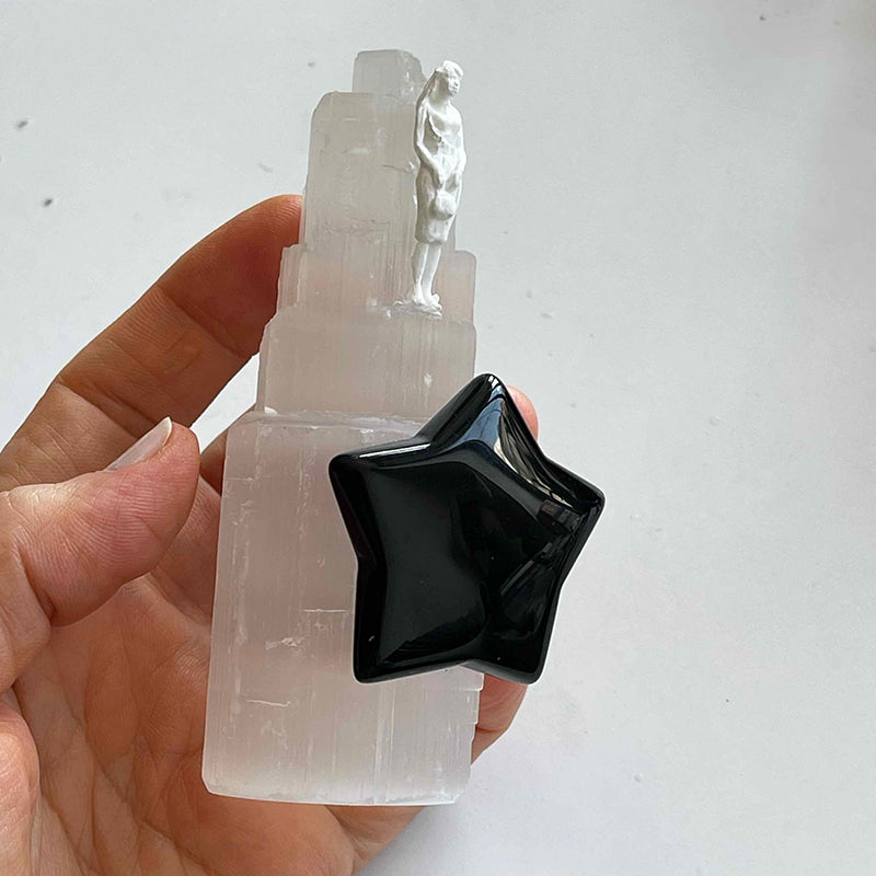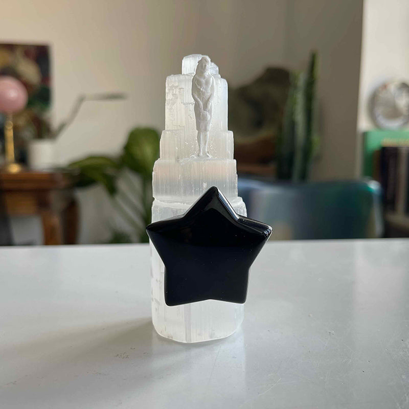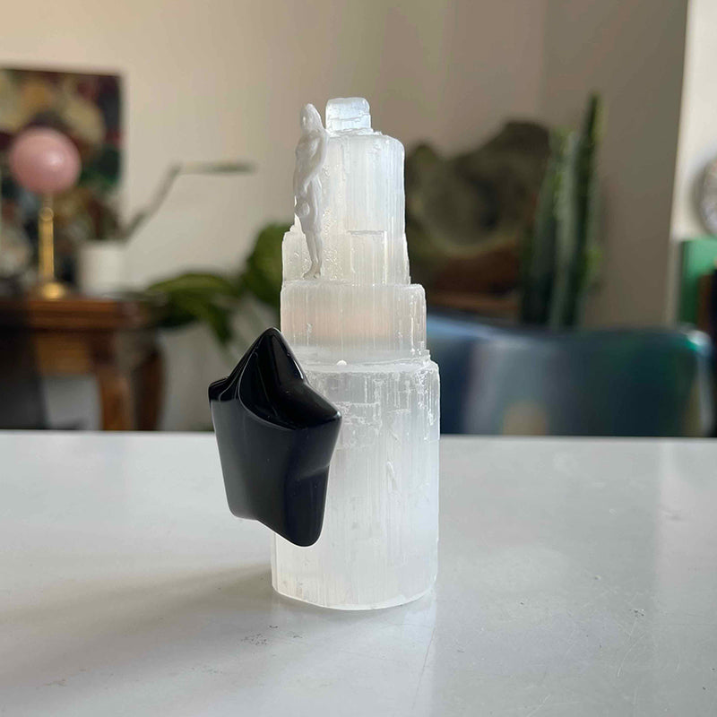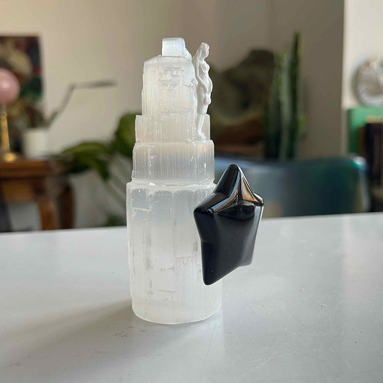Selenit kule, yıldız formunda Obsidyen ve kadın figüründen oluşan çalışma; birinciliği kendine vermiş birini sembolize ediyor. Hayatın içerisinde başarılı, başarısız, hatalı, hatasız, eksik, az ve çok yönlerimizle birinciliği en çok kendimiz hak etmiyor muyuz?